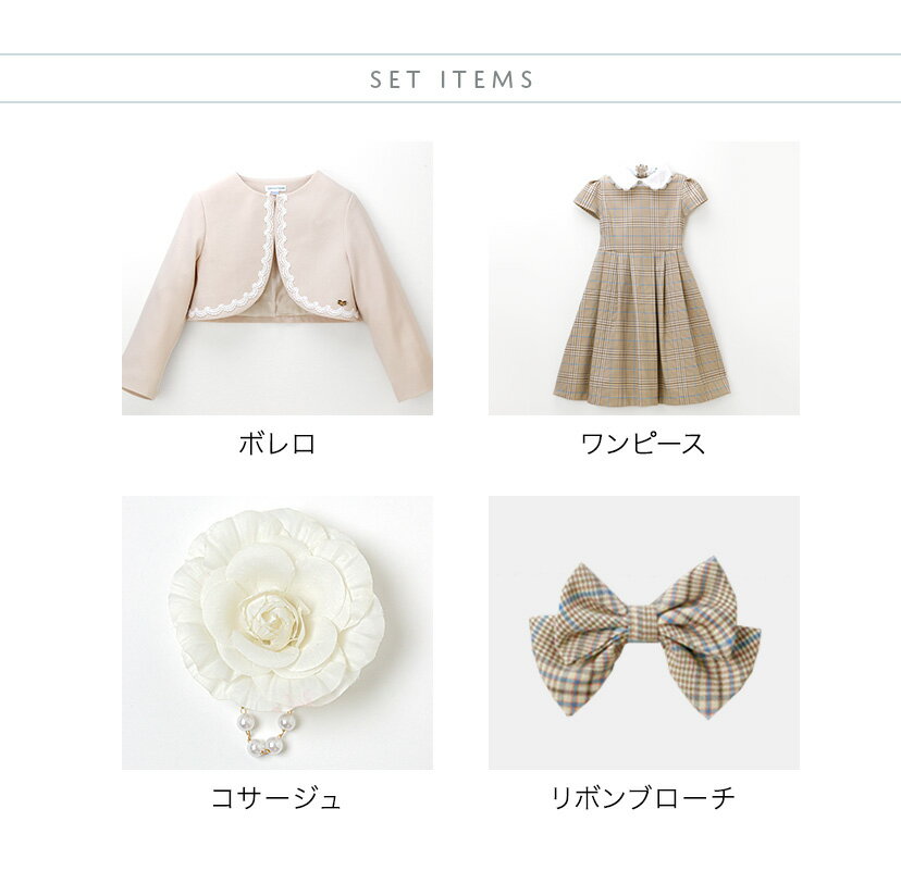 【ブラックフライデーSALE】 丸襟ワンピースとボレロのアンサンブル 入学式 女の子スーツ セットアップ ベージュ 青 グレー チェック柄 フォーマル コサージュ キャサリンコテージ TAK