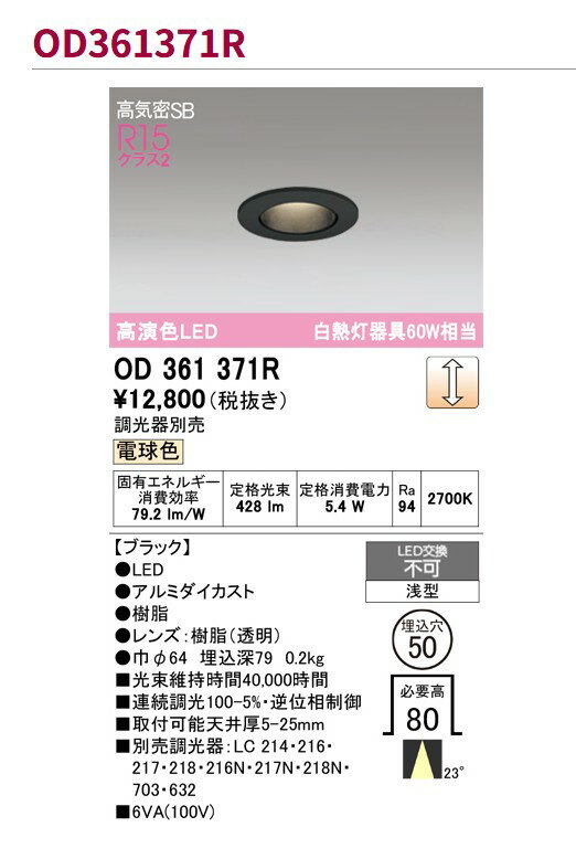 この商品のメーカーへのお問い合わせはコチラ → 高気密SB 高演色LED 白熱灯器具60W相当 OD361371R 電球色 2700K 調光器別売 消費電力5.4W Ra93 【ブラック】 ●LED ●ルミダイカスト●樹脂●レンズ:樹脂(透明) ●巾φ64 埋込深79 0.2kg ■光源寿命40,000時間 ■連続調光100-5%・位相制御 ■取付可能天井厚5-25mm 浅型 その他 ベース_ミディアム MINIMUM minimum MINIMUM ミニマム-Sご不在時の商品配達のご連絡のため、電話番号はなるべく携帯電話の番号を入力してください。