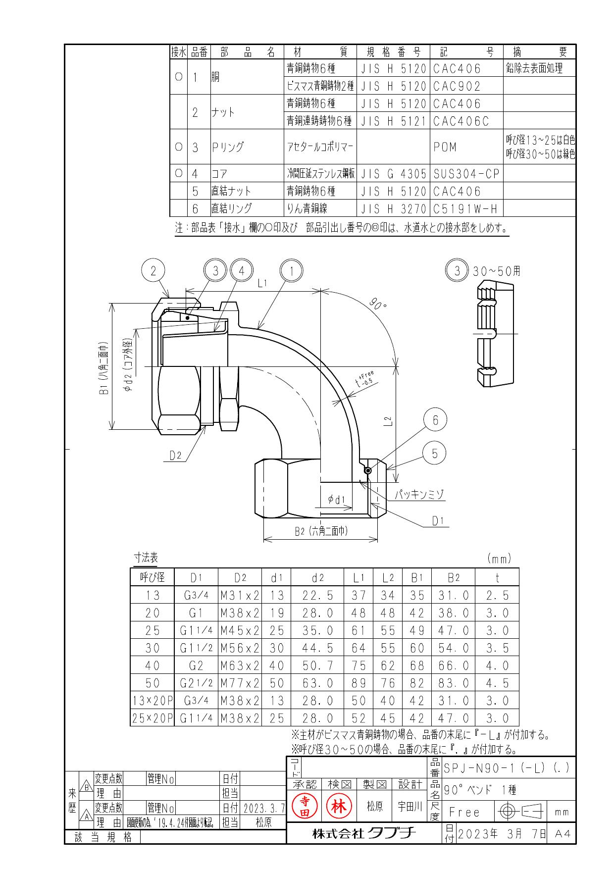 【13 SPJ-N90-1-L】 タブチ TABUCHI 耐震強化型SPジョイント(WSA B 011規格適合品) 90°ベンド 鉛レス銅合金 SPジョイント 埋設用給水商品 ポリエチレン管用金属継手 商品コード:33900101-25-1