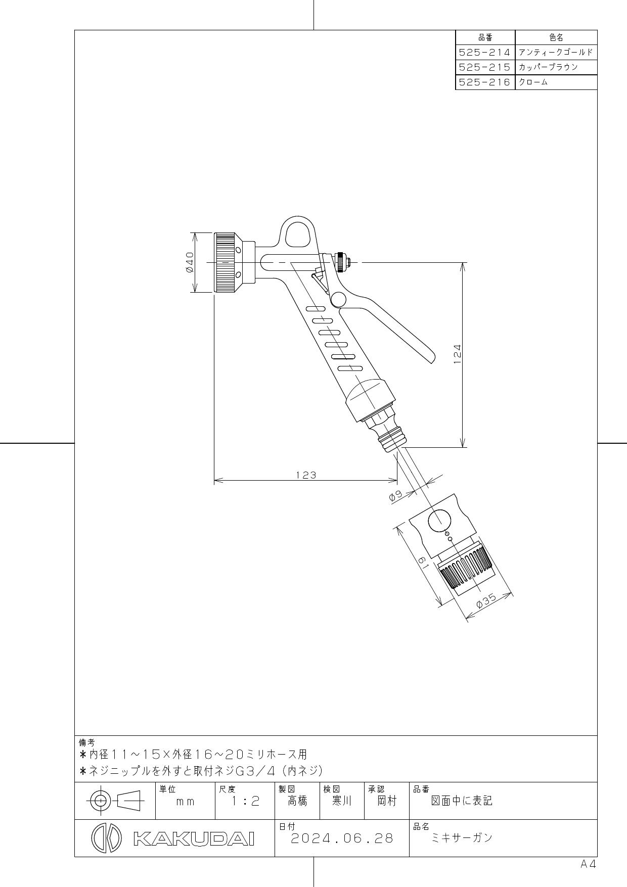 【525-215】 カクダイ ミキサーガン//カッパーブラウン●水流切替:レバー操作で直射・噴霧・止水●内径11〜15×外径16〜20ミリホース用●ホーセンド付き●ネジニップルを外すと取付ネジG3/4(内ネジ)カラー:カッパーブラウン材質:亜鉛注意文:※先端止水のできるノズルの使用後は水栓のハンドルで止水してください。先端止水したまま放置しますとホースが外れて漏水し家財に損害を与える恐れがあります。ご不在時の商品配達のご連絡のため、電話番号はなるべく携帯電話の番号を入力してください。