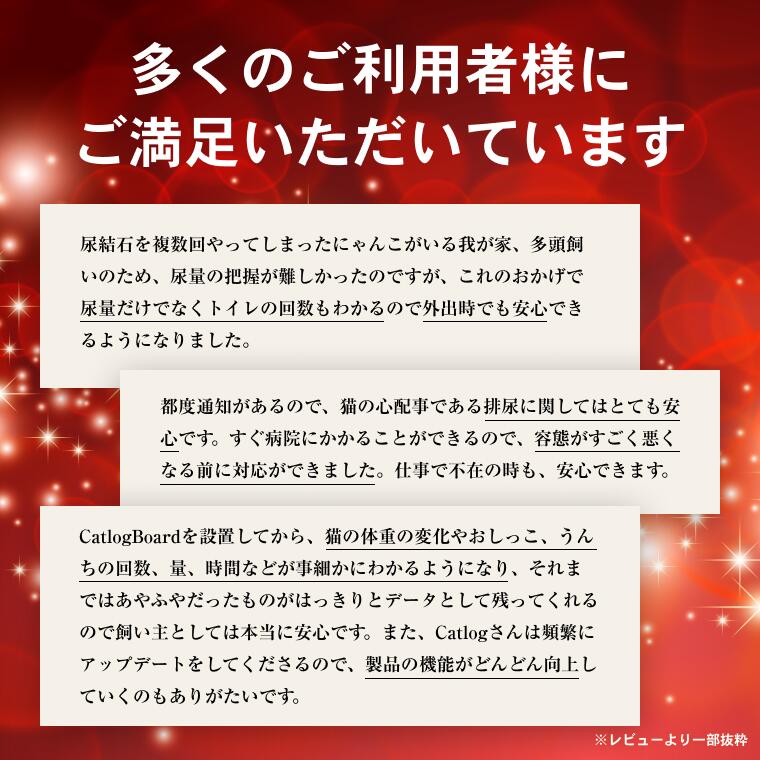 こちらの商品の利用には、楽天市場での電子機器購入に加え、別途楽天市場外での課金契約が必要となります。(課金先の企業名:株式会社RABO) ・本体価格とは別に、ご利用される猫様の数に応じて月額利用料金(猫様メンバーシップ ¥980/月)がかかります。 ・月額利用料金は、Catlogオフィシャルストアにてお支払い方法をご登録いただき、利用開始と共にお支払いが発生します。 ・月額利用料金のお支払方法は【クレジット決済およびAmazon Pay】となっております。(2025/2時点) ・月額利用料金の解約・変更を行う場合は、アプリ>「マイページ」>「猫様メンバーシップ管理」より、月額利用料金の自動購入を解約してください。自動購入の解約後は次回の自動購入が行われなくなり、手続き完了時点の有効期限の到来をもって【プラン未加入状態】となります。解約後も猫様やこれまでのデータは削除されず、引き続きCatlogアプリで見ることができます。 ・商品本体が故障、または紛失した場合でも、課金サービスは継続します。課金停止のためには別途サービスの解約手続きが必要です。 ・サービスに必要なアプリを削除しても、課金停止のためには別途解約のためのお手続きが必要です。 ・月額利用料金の解約に伴うデバイスの返品・返金は承ることができません。 ■体調管理に重要なおしっこ🌟 うんち💩の回数や量が分かります。もちろん、体重📈も Catlog Boardは、いつものトイレの下に置くだけで、排せつの量や回数、体重をすべて自動で記録。 おしっこ・うんちの判別に加えて、トイレの滞在時間も分かります。 トイレの種類、猫砂の種類、描種問いません。 ■排せつトラブルや異常な体重減少を逃さず検知🔔 泌尿器疾患にかかりやすい猫様に特化したAIシステムで異常を検知。また、様々な異常に繋がる体重減少も、見逃しやすい段階で気づいて対処することが出来ます。 ■🐈多頭飼いのファミリー🐈におすすめ!トイレ複数、猫様複数いずれもOK! Catlog Boardだけで複数の猫様を自動で識別し、猫様ごとにデータを記録をします シリーズ製品の首輪型デバイスCatlogがなくてもご利用いただけます。首輪が苦手な猫様にも。 ■猫様メンバーシップ🐱 ご利用される猫様ごとに猫様メンバーシップ(月額)へのご加入が必要です。製品購入後のセットアップ時にCatlogアプリ📱よりご登録ください。 1猫様あたり¥980~ / 月(税込)※6猫様目以降のご加入は ¥0 / 月 ご加入いただいた猫様のかけがえのない健康な生活を見守ります 1. 体調チェックの常時稼働 2. 通知の即時送信と解説 3. 猫様ごとの体調基準値作成 4. 全行動のAI解析 5. 猫様に合わせたAIの更新 6. 一生分のデータを保管 7. 観察記録の自由な追加 8. リアルタイム処理と表示 9. 共同飼い主の招待が無制限 メンバーシップは猫様毎のご登録になりますので、Catlog Home、Catlog Pendant、Catlog Boardを増設しても月額料金の追加はございません。
