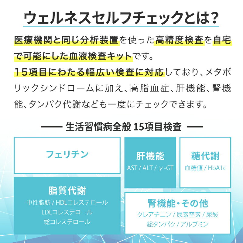 ウェルネスセルフチェック血液検査キットは、ご自宅で採血し、郵送するだけで健康状態をチェックできるセルフ検査キットです。 医療機関に行かなくても、生活習慣病のリスクや栄養状態を確認でき、予防や改善のための指標を得られます。 ▼ 商品詳細 ▼ 「ウェルネスセルフチェック」の特徴 こんな方におすすめ 生活習慣病の検査(早期発見)をしたい方 血液検査を定期的に受けていない方 忙しくて時間がない、病院で長時間待たされるのが嫌な方 ●ウェルネスセルフチェックとは? 「ウェルネスセルフチェック」は、医療機関と同じ分析装置を使った高精度検査を自宅で可能にした血液検査キットです。 パッケージにもある通り、15項目にわたる幅広い検査に対応しており、メタボリックシンドローム(中性脂肪、HDLコレステロール、血糖など)に加え、高脂血症、肝機能、腎機能、タンパク代謝などについても一度にチェックできます。 「ウェルネスセルフチェック」の検査15項目 フェリチン -脂質代謝- 中性脂肪、HDL コレステロール、 LDLコレステロール、総コレステロール -肝機能- AST、ALT、γ-GT -糖代謝- 血糖値、HbA1c -腎機能・その他- クレアチニン、尿素窒素、尿酸、総タンパク、アルブミン ●検査キット内容 検査キット内容のイメージ 1. ランセット:指先にキズをつけます(1つは予備) 2. 吸引器:血液を吸い取ります 3. シリンダー:血液を分離します 4. 密閉キャップ:分離血液を密閉します 5. ボトル:検査溶液と血液を混ぜ、血液を分離します 6. 絆創膏 7. 消毒布 ●検査方法 検査はわずか3ステップ! step 01 キット入手、お手元に検査キットが届きます step 02 自分で採血、手順に沿って少量の血液を採取 step 03 ポストへ投函、同封の返送用封筒で郵送 → 検査機関で分析、医療機関と同等の装置で測定 → 検査結果の速報通知、結果はメールで確認 ・検査結果の内容 専門医の監修による、あなた専用のアンチエイジングレポートをお届けします。 ・検査キットの精度 ・特許取得済み技術を利用した最先端の医療機器