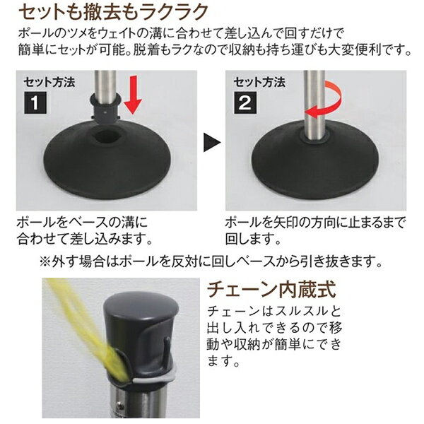 商品名テラモト チェーンスタンド アルミチェーン製品型番SU-662-000-0製造販売元株式会社テラモトサイズ320×320×860mm重量5.5kgJAN4904771113623材質チェーン:アルミ、台座:ゴム・TPE、ポール組部品:ステン・ポリエチレン・ナイロン支柱Φ60チェーン長さ2.3m注意事項 お客様にて組立が必要です。カタログデータメーカー希望小売価格はメーカーカタログに基づいて掲載しています▼ 同梱について ▼単品配送です同梱不可 (単品配送品は他商品との同梱ができません) ▼ 代金引換 ▼不可(代金引換でのお取引はお受けできません)カート内で選択できますが、不可商品の代引購入は購入後キャンセルとさせて頂きます▼ 時間帯指定 ▼不可(業務用便の為、希望に添えない場合があります)▼ この商品の返品について ▼・こちらの商品は【返品不可】な商品です。出荷後お客様のご都合による返品はお受けできません ・化学製品、取寄せ商品、受注生産商品は性質上、お受けできません ・返品についてはお客様サポート「返品・交換・保証について」をご確認頂き、ご注文にお進みください▼ 出荷・配達について ▼ ・業務用の出荷便の為、日曜・祝日配達はお受けできない事があります・大型商品や大量の個口となる場合は、業務用配送便でのお届けとなります。その際、マンション上階やビル施設内への配達ができず、軒先渡し・車上渡しとなる場合がございます。恐れ入りますが、その場合は受取人様にてお荷物のお受け取りおよび移動をお願いする必要がございますので、あらかじめご了承ください。 ・同時に注文する商品によっては、別々の配達便になる場合があります ・環境を配慮し、出荷時の梱包は簡易もしくは無包装となります チェーン内蔵式で設置・撤収が効率的なアルミチェーンスタンド SU6620000!外でも中でも活躍する屋外・屋内両用タイプで様々なシーンにマッチするスタイリッシュなスタンドです。●チェーンはポールの中に内蔵されておりスルスルと出し入れできるので移動や収納が簡単にできます。※チェーンの取り出し、固定が簡単な【くるっとロック採用】●ポール端面に防鎮処理を施しており屋外、雨天にも対応します。●チェーンの種類:アルミ●チェーン長さ:約2300mm●サイズ:台座が約Φ320mm、高さ860mm●通常メーカー在庫品です。
