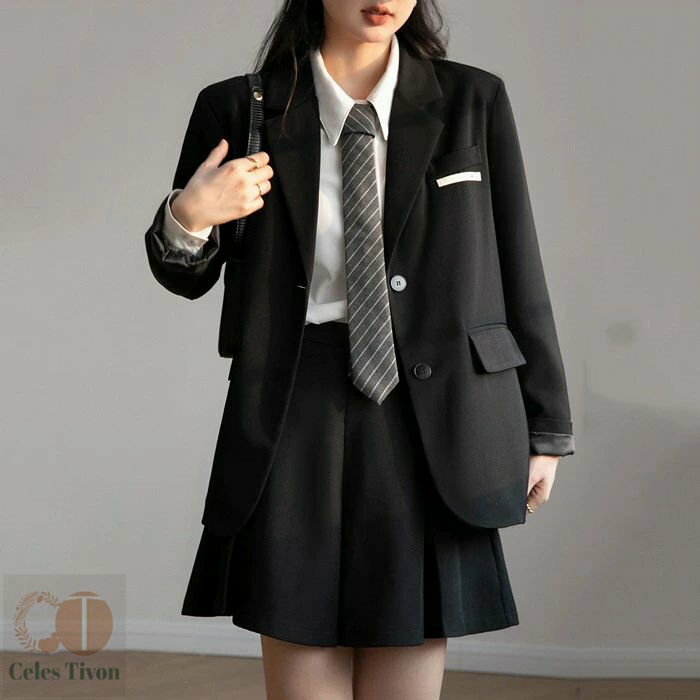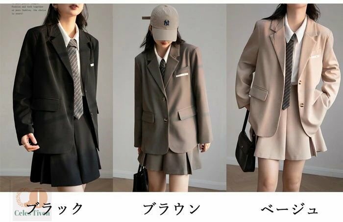 【上下2点セット】ジャケット プレザー 入学式 卒業式 ボックスプリーツスカート スカート 女の子 レディース ブラック 黒 ブラウン ベージュ 長袖 無地 韓国風 高校生 女子高生 受験 結婚式 発表会 通学 フォーマル JK イベント 学園祭 演劇 舞台 学芸会 文化祭