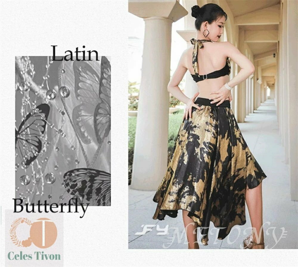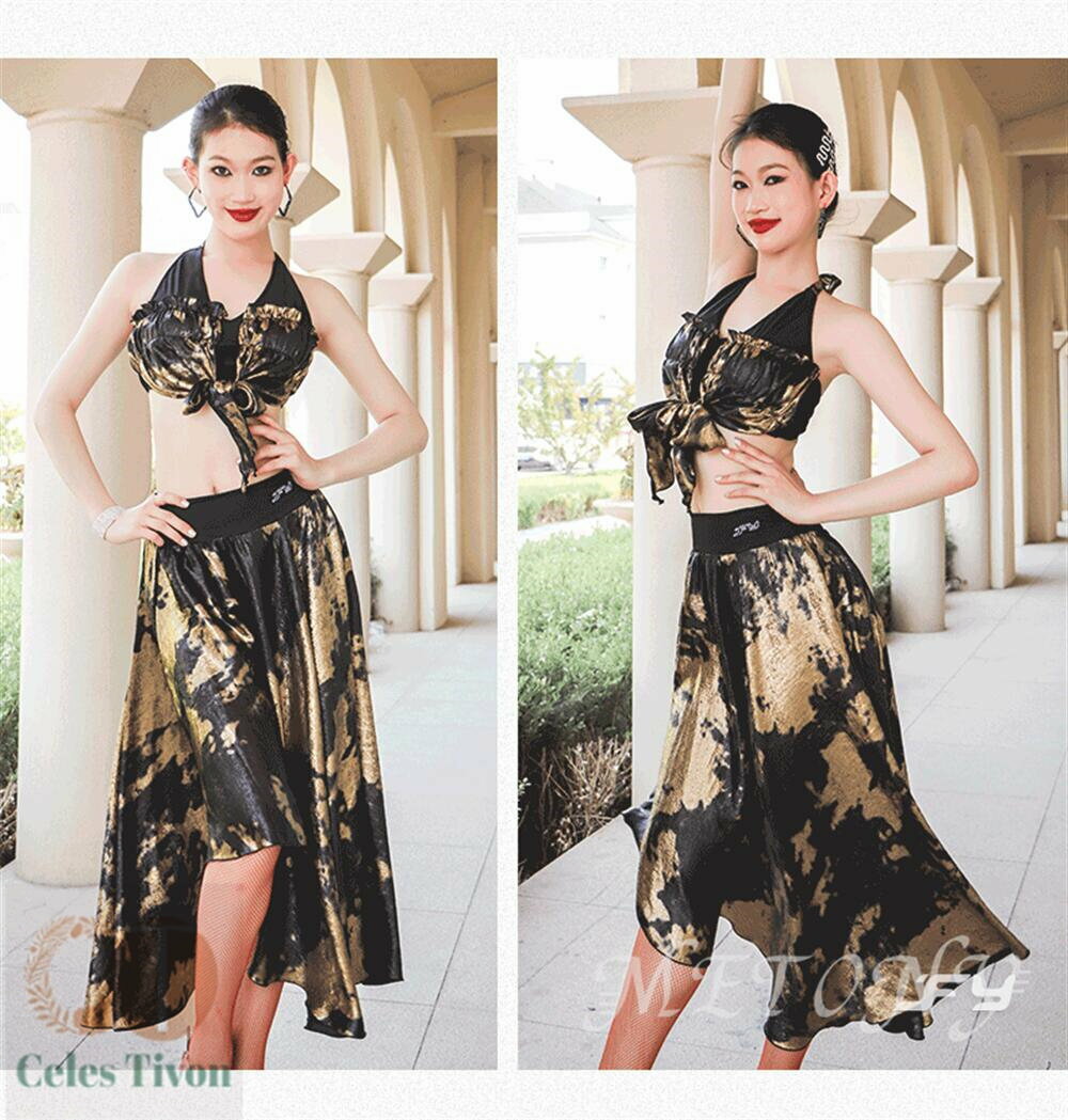 社交ダンス ダンス服 ダンスドレス タンゴ ラテンダンス ベリーダンス おしゃれ 豪華 大きい裾 ブラックゴールド セクシー 上下セット 舞踏会 ステージ 忘年会 イベント パーティ 発表会 祭り S M L XL