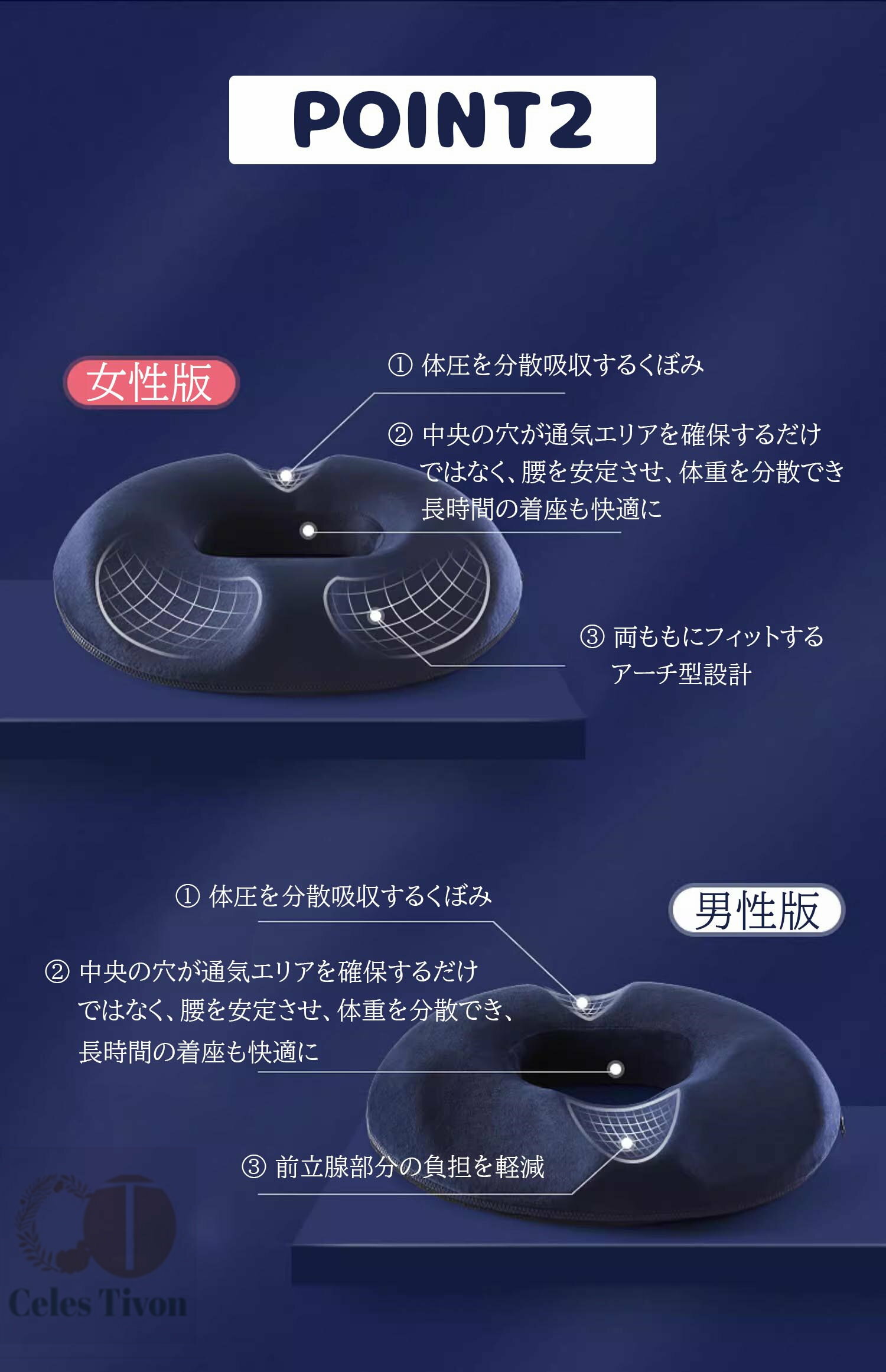【カラー】 女ローズレッド 女グレー 女ネイビー 女ピンク 女パープル 女コーヒー 女ブラック 男グレー 男ネイビー 男コーヒー 男ブラック 【素材】 本体:高品質ポリウレタン カバー:ポリエステル、綿 セット内容:クッション+カバー 生産国:中国 重量:約0.45kg 【女性版と男性版の区別】 【女性版】 ふた股へのアーチ型デザイン 1.後ろ凹んだ所はお尻とぴったりで、美尻効果もあります。 2.腰をしっかりサポートして、脊椎と尾骨への負担を軽減することが可能。 3.特に妊娠中、産後や手術後の回復には効果が現れます。 【男性版】 前立腺部分へのデザイン 1.長時間デスクワークのサラリーマンに向け、自然な背骨曲がりを防ぎます。 2.痔の痛みを和らげることもできます。 【特徴】 人間工学に基づいたヘルスケア座布団 ●高反発素材は着席時に沈み込みすぎず、体圧を適度に分散しますので座り心地を安定させて「肩こり・腰痛」を和らげます。 ●硬めの高反発ウレタンフォームは潰れにくくお尻の形に合わせてゆっくり変形します。 ●痔や手術後の触れたくない傷口もしかっり守ります。 ●中心部の穴に向かってゆっくり沈み込みクッションに深く座り込むことで、 ●背筋を伸ばして長時間でも疲れにくく快適にお座り頂けます。 ●カバーは取り外し可能。お洗濯して清潔にお使いいただけます。