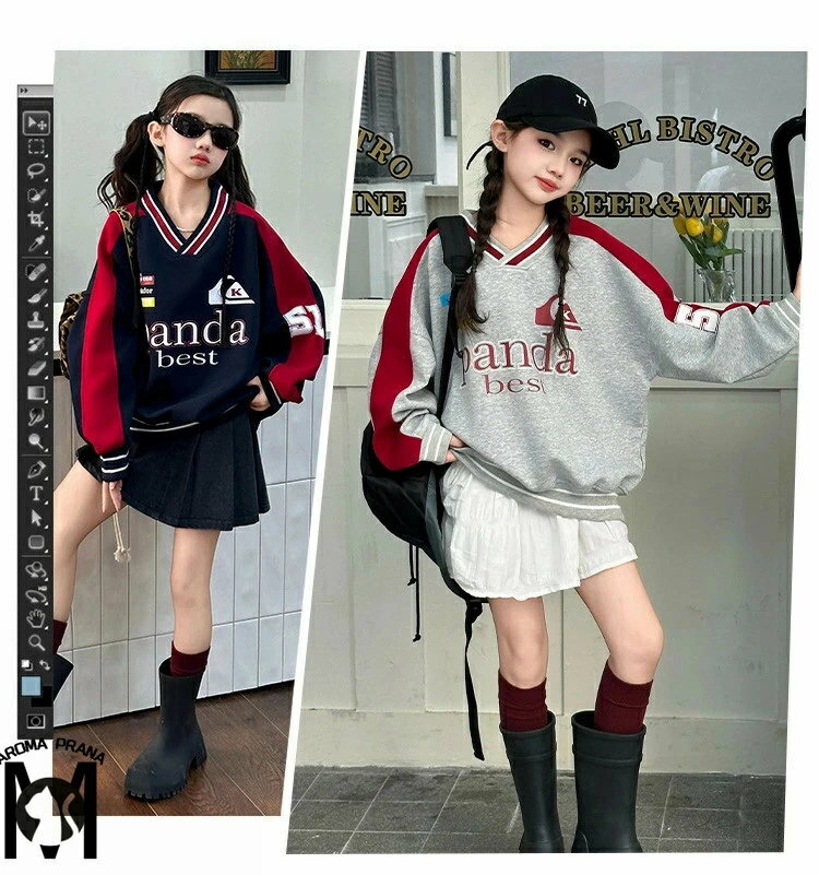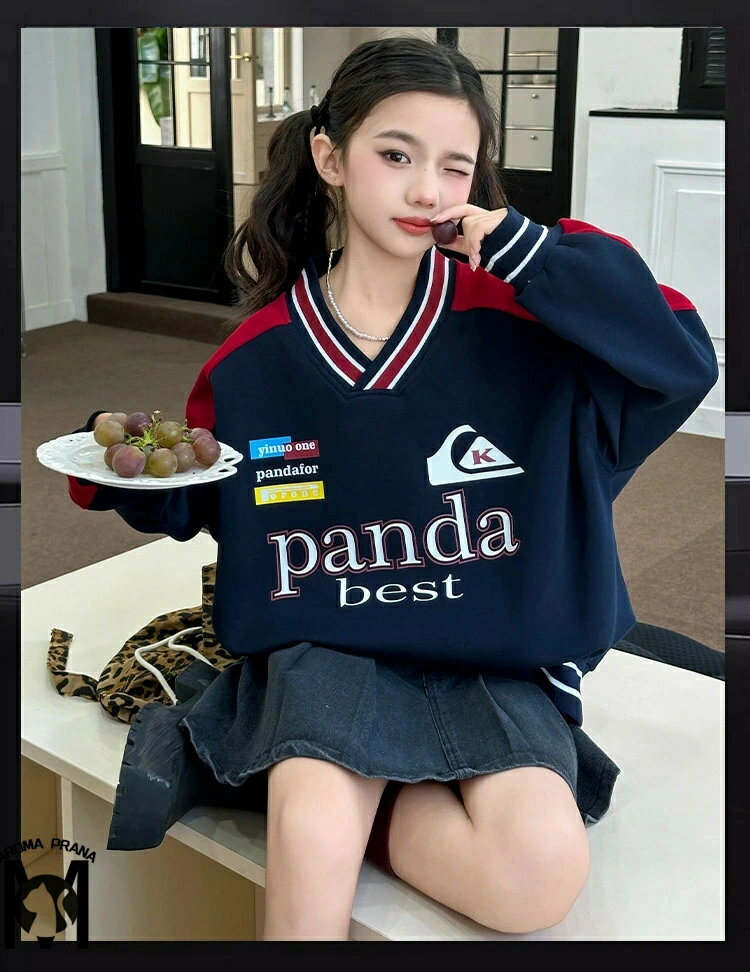 韓国子供服 トレーナー 女の子 可愛い スウェット ネイビー グレー Vネック ダボダボ ダンス衣装 ヒップホップ 韓国 Y2K KPOP ガールズ ジャズ キッズ 姉妹 お揃い おしゃれ 長袖 こども オシャレ 春秋冬 小学生 中学生 120-170cm