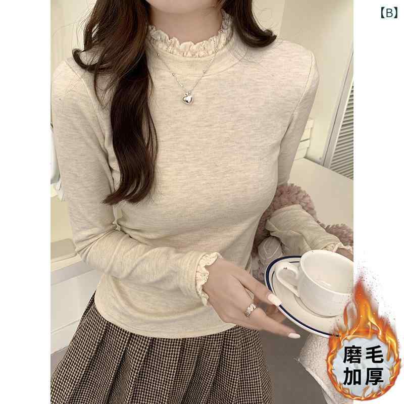 長袖Tシャツ レディース ハーフハイネック レース 起毛 秋冬 優しいフェミニン インナー ベースレイヤー 通勤 通学 部屋着 接触冷感 吸湿速乾 綿 麻 デニム 再生繊維 ブラック ピンク系