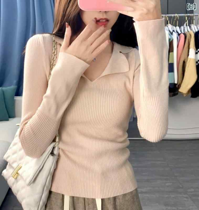 春夏 レディース ニットセーター ポロ襟 スリムフィット 長袖 トップス 肌触り ピットストライプ 合わせやすい 気質 エレガント ベーシック インナー 軽量 吸湿速乾