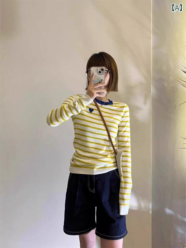 レディース 春夏 ニットインナートップス ストライプ コントラストカラー ハート刺繍 デザイン かわいい 吸湿速乾 軽量 切り替え