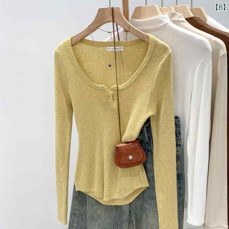 レディース 長袖 ニット インナー トップス 半開き襟 ボタン 質感 スリムフィット 春夏 スタイルアップ ベースレイヤー 修身 肌触り 洋風