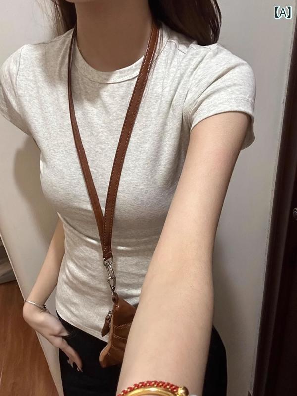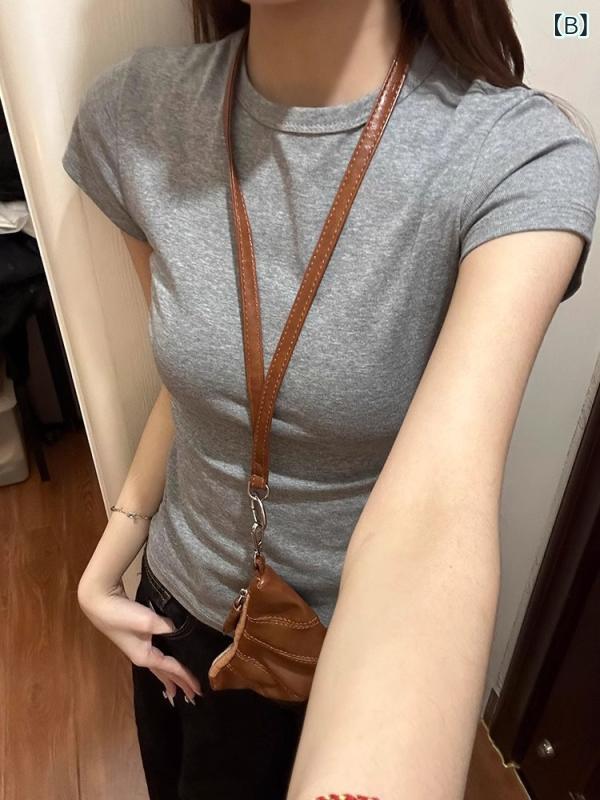 Tシャツ レディース 春夏 グレー 丸首 ショートスリーブ スリム 綿100% インナー 小柄向け ベーシック トップス 修身 基礎款 打底シャツ 上衣