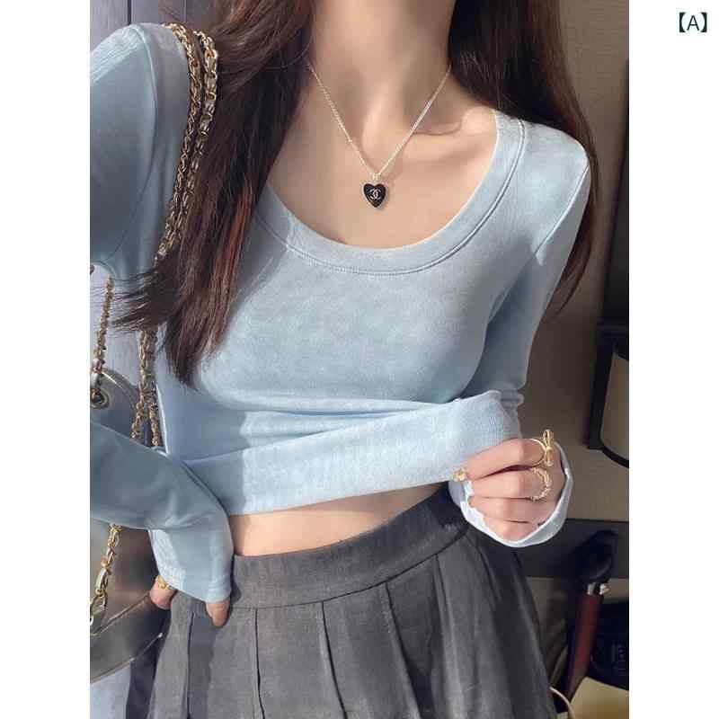 Tシャツ レディース 秋冬 インナー 長袖 Uネック 鎖骨見せ 韓国風 短丈 クロップド トップス ブルー 接触冷感 吸湿速乾 軽量