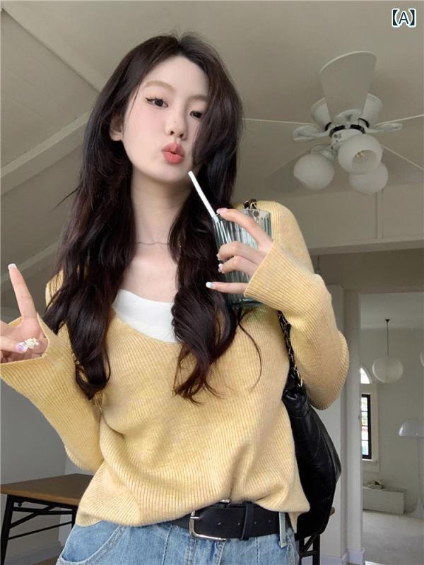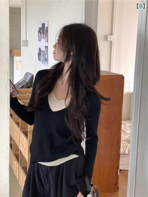 ニットセーター レディース 秋冬 Vネック 切り替え フェイクツーピース スリムフィット スタイルアップ カジュアル インナー トップス 韓国風 デザイン 修身 休闲 上衣