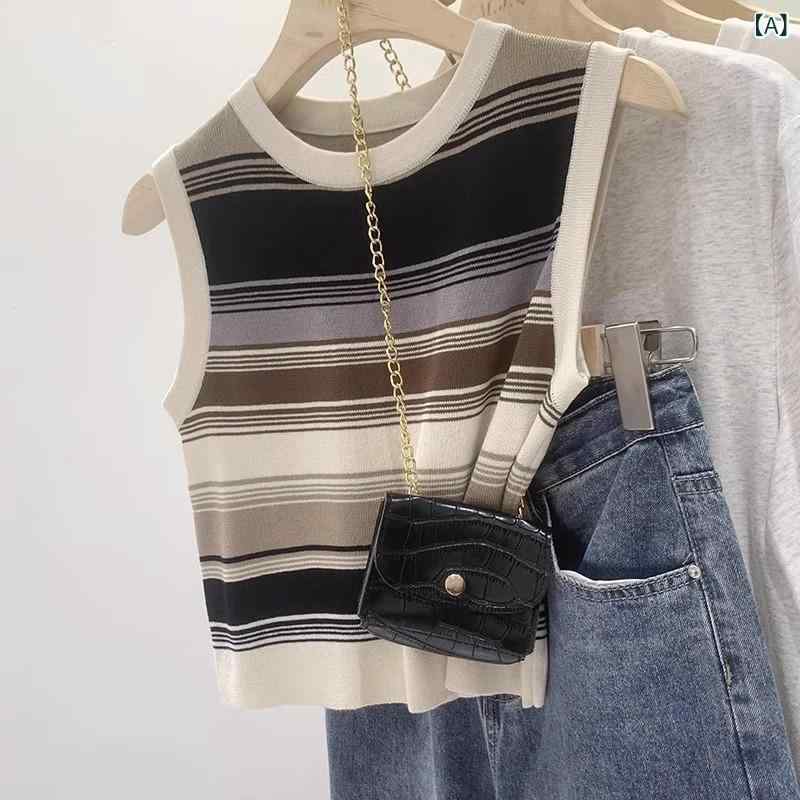 レディース ノースリーブ ニット ベスト ストライプ 薄手 コントラストカラー スリムフィット 春夏 トップス 修身 無袖 背心 針織 女 上衣