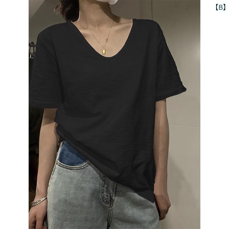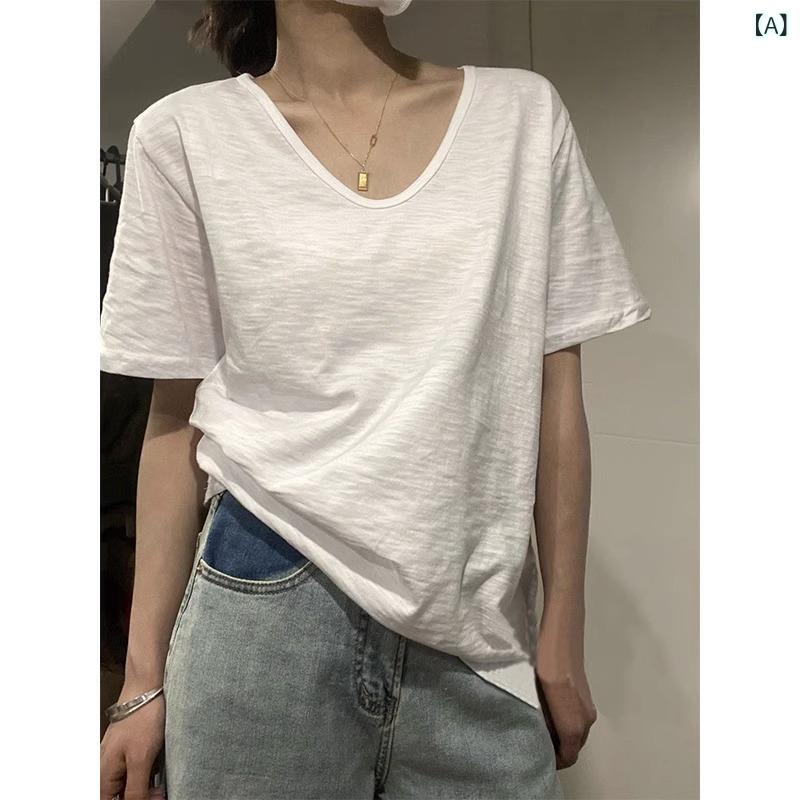 春夏 レディース Tシャツ Vネック 短袖 薄手 ゆったり スリム ベーシック トップス ホワイト コットン スラブ生地 日常 部屋着 吸湿速乾 軽量