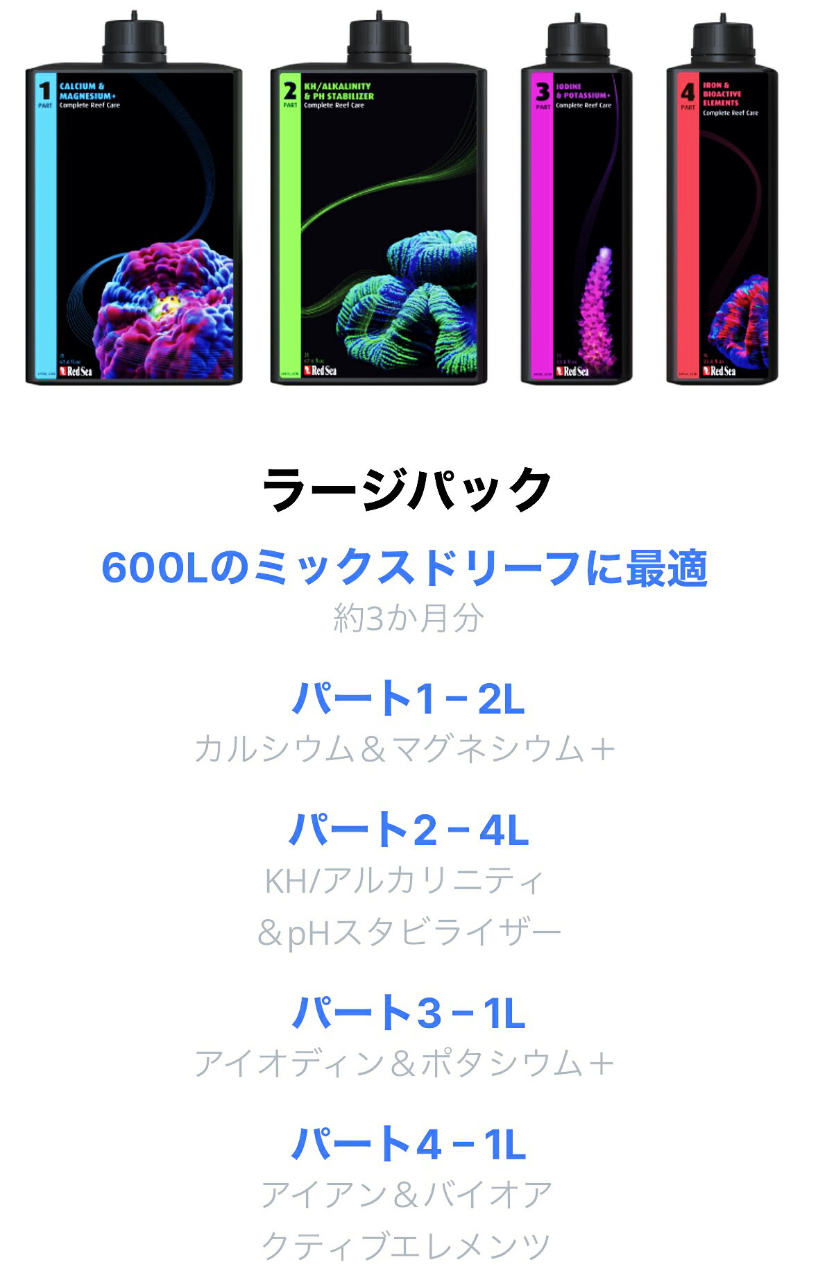 RedSea Complete Reef Care Large レッドシー・コンプリートリーフケア・ラージ カルシウム消費量を基に添加できる4液構成の添加剤 特徴 ・30 年にわたる独自の研究に基づいて開発された4 つの添加剤からなるコンプリートリーフケアは、サンゴ水槽で定期的に消費される36 種類の主要元素、中間元素、微量元素のすべてを補充することで、サンゴの成長と発色を促進します。 ・週1 回のカルシウムの測定だけで、4 つの添加剤の投与量を決めることができます。 ・4 つの添加剤は同じ比率で使用されるので、すべて同時に使い終わるように設計されています。 ・ドーシングポンプでの添加に最適です。 ラージパック ・ラージパックは600リットルのミックスドリーフ水槽に最適です。 ・約3ヶ月分 ・パート1=2リットル:カルシウム&マグネシウム+ ・パート2=4リットル:KH/アルカリニティ&pHスタビライザー ・パート3=1リットル:アイオディン&ポタシウム+ ・パート4=1リットル:アイアン&バイオアクティブエレメンツ 検索キーワード:RedSea レッドシー 添加剤 海水魚フード 水質調整剤 コンディショナー ※ご確認ください※ ■「北海道」の発送について 北海道への発送はショップの送料負担が大きいため送料無料ラインの条件を満たしていても必ず1500円の別途料金が発生いたします。 ご購入の際はご注意ください。 ■沖縄・離島」発送不可について 「沖縄・離島」への発送については、ショップの送料負担が大きいのとトラブル(航空法など)が多発しているため注文を お受けすることができません。RedSea コンプリートリーフケアラージComplete Reef Care Large レッドシー カルシウム消費量を基に添加できる4液構成の添加剤 5