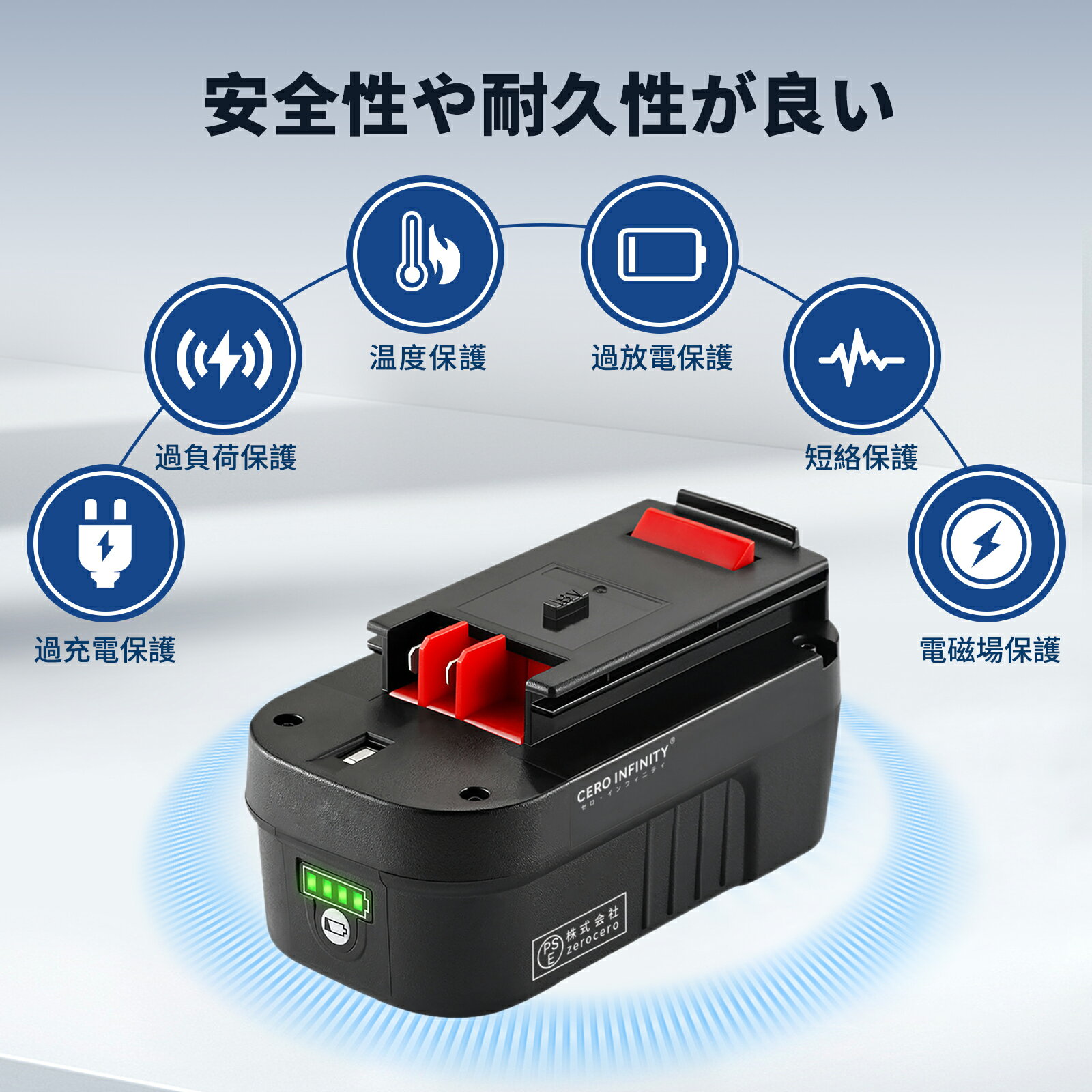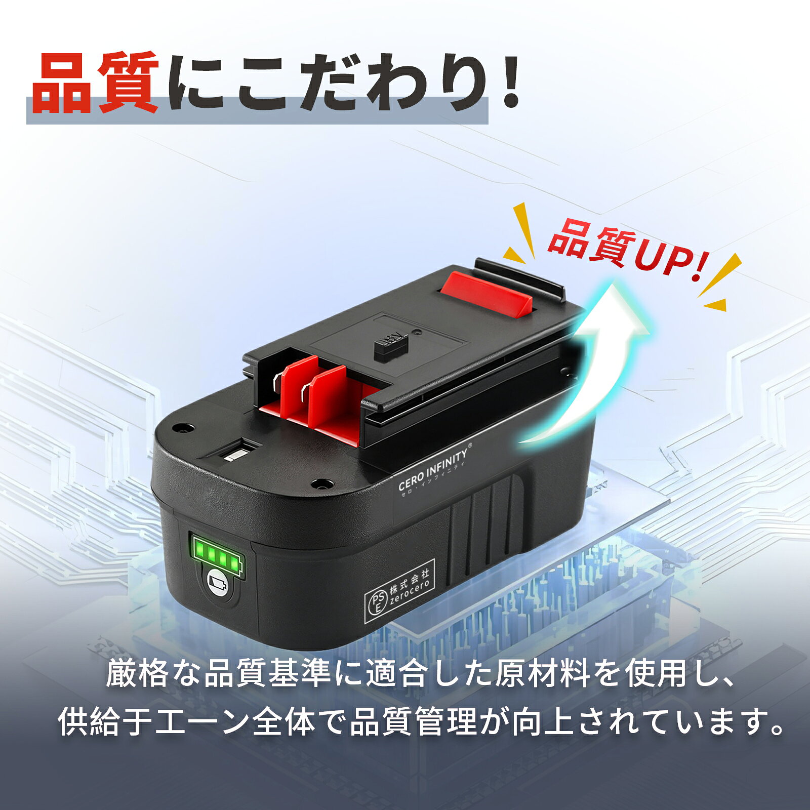 ブランド BALCK DECKER 電圧 18V 容量 5000mAh 純正品型番 対応機種 HPB18 メーカー型番 DTHPB18ZZZBK-AAA-YKGRZE HPB18 この商品は互換用バッテリーです ■重要注意事項■ 1. 製品仕様は改良のため予告なく変更する場合がございます 2. 実際の駆動時間は使用条件により異なります 3. 正規品とは外装デザインが異なる場合があります 注文前の重要確認事項 ▲個人輸入商品の利用制限 ■注文者本人による「使用/消費」のみ許可 ■第三者への譲渡・転売は電気用品安全法第29条違反 商品仕様について ◆同一性能商品の価格差はメーカー部品調達先の違いによるもので、品質・機能に差異は一切ありません 品質保証基準 ◆PSE認証について ■生産時期,モデル更新に伴い申請業者が変更される場合あり ■全て「電気用品安全法」適合品(認証番号要確認可) ?PSEマークの種類:PSE ?届け出事業者名:株式会社zerocero