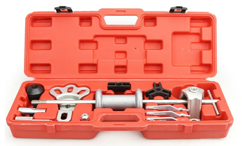 引っ張り作業に重宝! ドライブラインの修理・交換や板金作業に欠かせない工具です。 ・車、バイクの整備、タイヤ交換などに! ・大きなハンマーでとっても強力!! ・シャフトやベアリングはもちろん、プーリーやベアリング等の取り外しも簡単に行えます。 7種類のアタッチメントがセットされていますので、幅広い用途に対応しています。 また、4穴&5穴兼用のハブプーラーも付いています。 これあると、FF車のフロントハブやFR車のリヤシャフト、ブーツ、ベアリングなどを抜き取ることができます。 専用収納ケース付で持ち運びも便利! 商品仕様 スライディングハンマーの先端のネジ径:5/8" ピッチ:18tpi 重量:8.0kg ●セット内容 ハンマー(2.2kg) シャフト(560mm) Bigプーラー グリップレンチアダプター 2爪フックヘッド 3爪フックヘッド レッグセット 3ピースフック Smallプーラー センターボルト ※ハンマーで手や指を挟まないよう、ハンマーの中央を握ってください。 ※抜き取り対象物に対して、垂直に力が掛かるように使用してください。 ※各フック、アタッチメントは消耗品です。