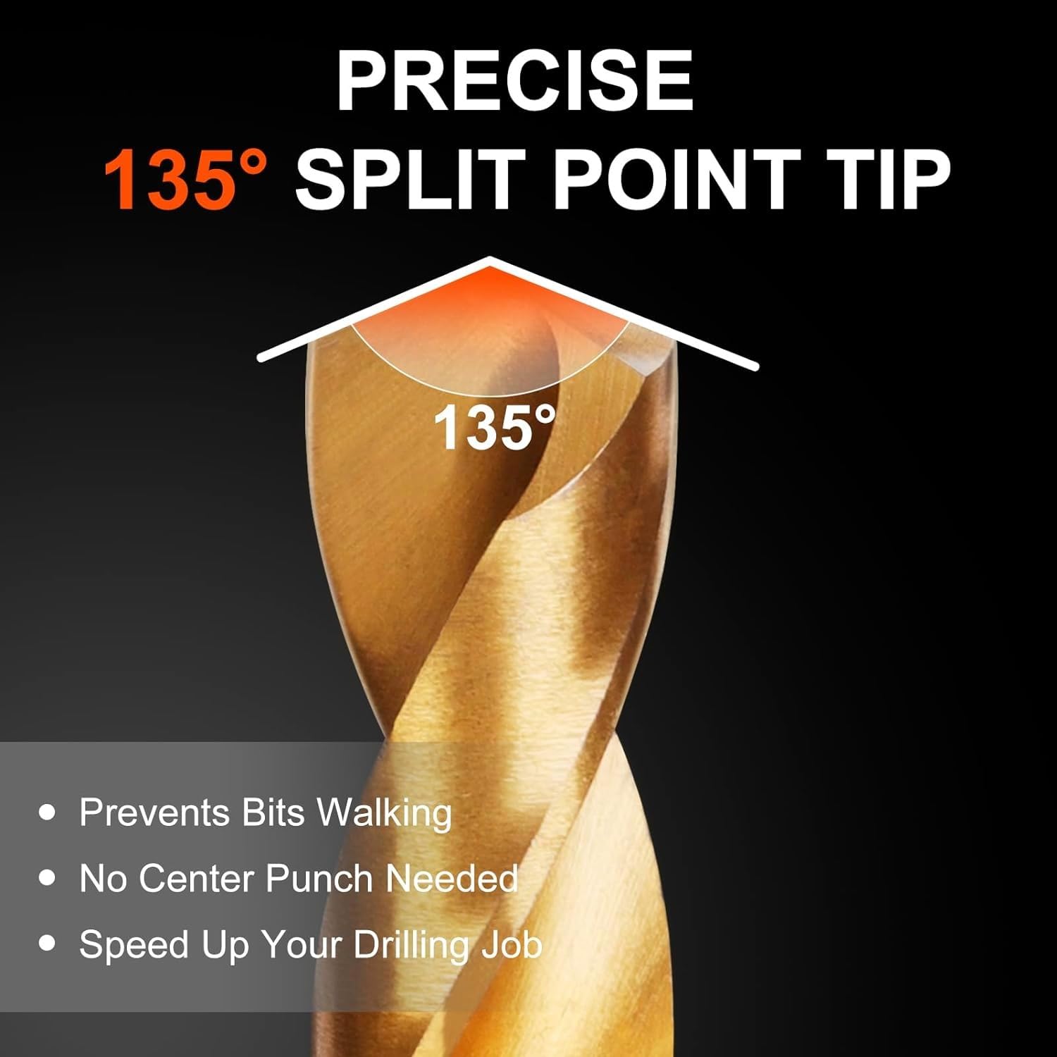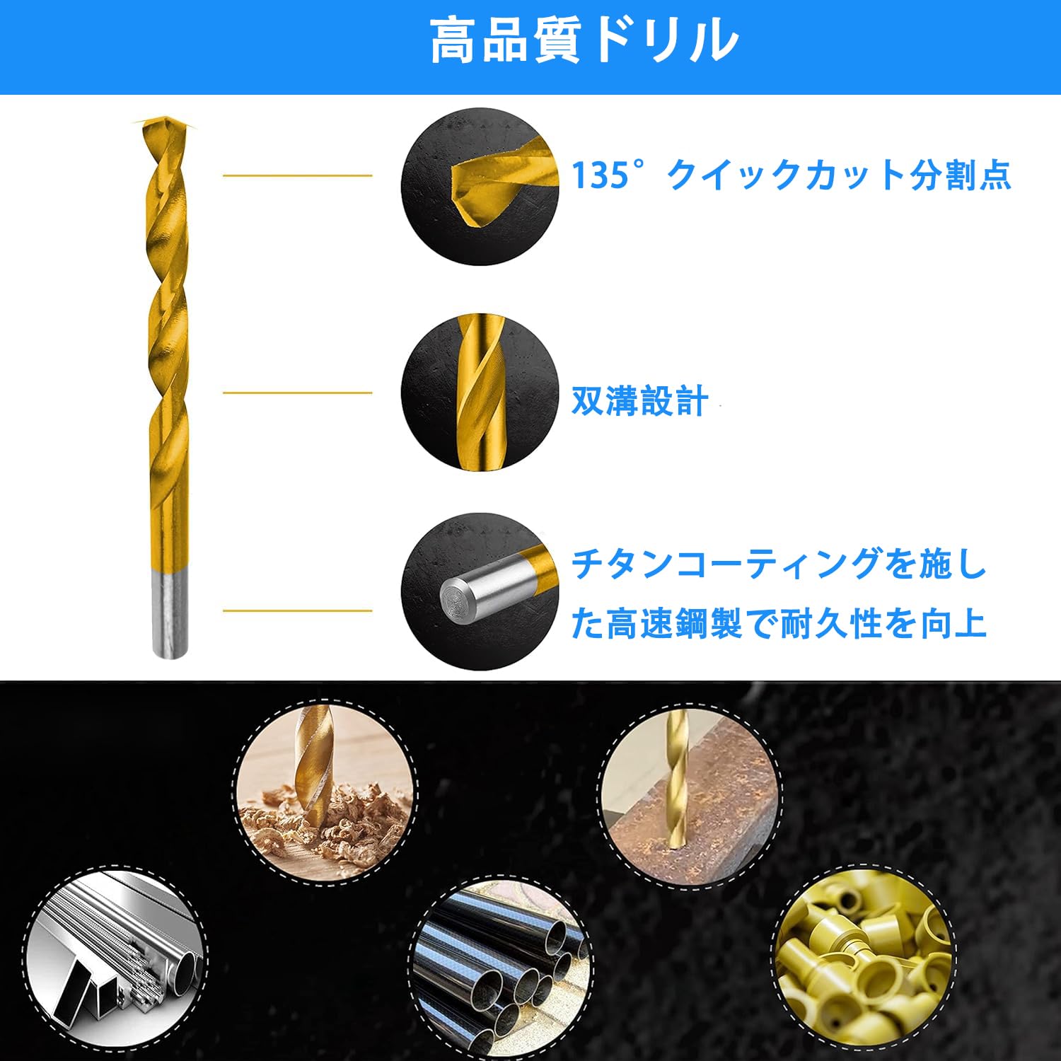 ● HSS鋼チタンコート刃です。 ● 充電式ドライバー・充電式ドリルドライバー・スクリュードライバー対応 ● ステンレス・難削材・一般鋼材・軽金属などの穴あけに ● 強ネジレ形状で軽く、速く穴あけできる特殊ウルトラ多層コーティングにより耐熱性抜群のドリル刃 ● ステンレス鋼に最適な溝形状で溶着が少なくスムーズな穴あけができます ● 木材、プラスチック、アルミニウム、銅、軟鉄など細いドリル刃はとても折れやすいので、怪我に気をつけてください。 ● 金属は切削油の御利用をお勧めします。 ◆ 用途:鉄・アルミ・樹脂・木材への穴あけ作業 ◆ 軸径:6.35mm/丸軸 ◆ 材質: HSS鋼 ◆ セット内容: 1.5mm×16/2.0mm×16/2.5mm×15/3.0mm×10/3.2mm×10/3.5mm×8/ 4.0mm×8/4.5mm×3/5.0mm×3/5.5mm×2/6.0mm×2/6.5mm×2/8mm×2/10mm×2