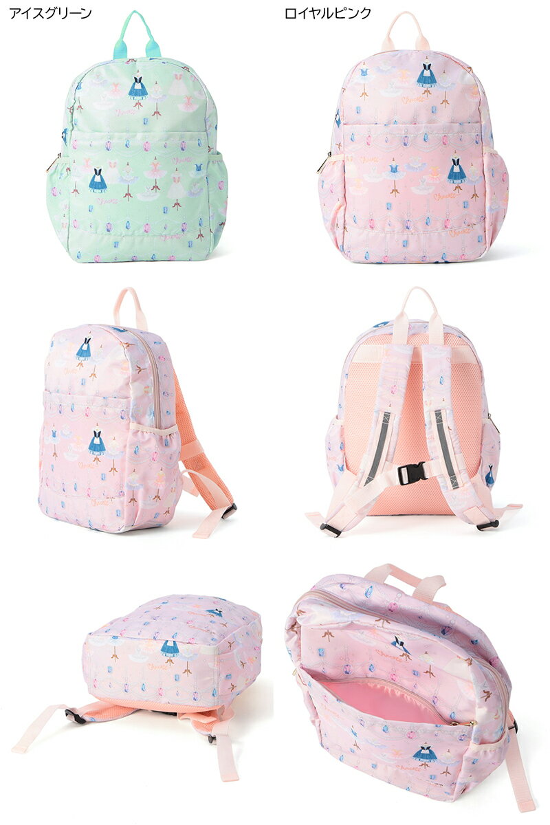 宝石とパールのシャンデリアに衣装が描かれたキュートなバレエ総柄のリュック 【デザインポイント】 前方部分はフラットなファスナー付きポケットで、お子様でもファスナーが開けやすい仕様。 ※それぞれ柄の出方は異なります。 【外ポケット】 あり ●サイズ:約縦33.5×横24.5×マチ11.5(cm)●カラー030アイスグリーン、040ロイヤルピンク●容量:約6(L)●素材:表地:ポリエステル●原産国:中国