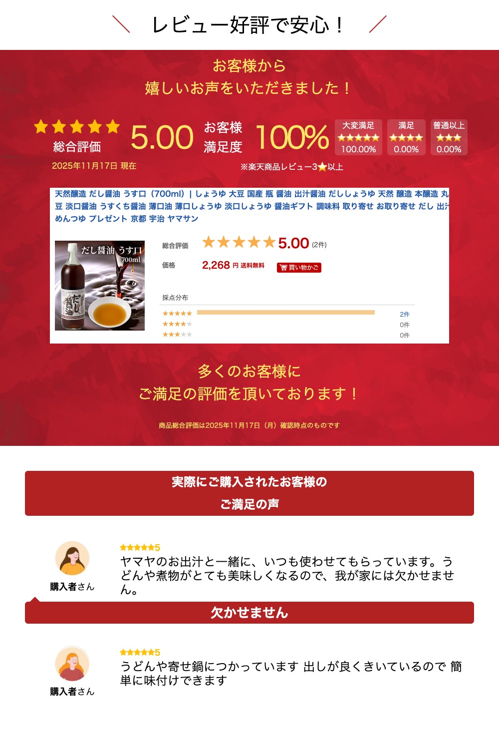 【「本醸造丸大豆醤油」を基に天然原料のみで造りあげています】 お料理の素材を最大限に活かすために必要な「だし」。 その中でも昆布だしは和食の命とも言われています。 本品は醤油の本場、兵庫県の龍野で造られた「本醸造丸大豆醤油」を もとに北海道の昆布から抽出した天然エキスを中心とした 天然原料のみで造りあげています。 素材を活かす色、味、香り。炊き込みご飯、お吸い物、寄せ鍋等、幅広く使えます。 名称:うすくちだししょうゆ 原材料名:うすくちしょうゆ(本醸造)、食塩、昆布エキス、砂糖、かつおエキス、発酵調味料、酒精、酵母エキス、(原材料の一部に大豆、小麦を含む) 内容量:700ml 賞味期限:製造日より2年 塩分:約15.0% 様々な贈り物にご利用いただけます。 季節の贈り物 御正月 お正月 御年賀 お年賀 御年始 母の日 父の日 初盆 お盆 御中元 お中元 お彼岸 残暑御見舞 残暑見舞い 敬老の日 寒中お見舞 クリスマス プレゼント お歳暮 御歳暮 春 夏 秋 冬 お祝い事の贈り物 内祝い 御見舞 退院祝い 全快祝い 快気祝い 快気内祝い 御挨拶 ごあいさつ 引越しご挨拶 引っ越し 志 進物 寸志 粗品 のし 熨斗 メッセージ カード 長寿祝い 還暦 還暦御祝い 還暦祝い 祝還暦 古希 祝古希 古希御祝 喜寿 祝喜寿 喜寿御祝 傘寿 傘寿御祝 祝傘寿 米寿 祝米寿 米寿御祝 卒寿 祝卒寿 卒寿御祝 白寿 白寿御祝 百寿御祝 祝白 百寿 祝百寿 賀寿 寿 寿福 祝御長寿 合格祝い 進学内祝い 成人式 御成人御祝 卒業 卒業祝い 御卒業御祝 入学祝い 入学内祝い 小学校 中学校 高校 大学 就職祝い 社会人 幼稚園 入園内祝い 御入園御祝 お祝い 御祝い 金婚式御祝 銀婚式御祝 御結婚お祝い ご結婚御祝い 御結婚御祝 結婚祝い 結婚内祝い 結婚式 引き出物 引出物 引き菓子 御出産御祝 ご出産御祝い 出産御祝 出産祝い 出産内祝い 御新築祝 新築御祝 新築内祝い 祝御新築 祝御誕生日 バースデー バースディ バースディー 七五三御祝 753 初節句御祝 節句 昇進祝い 昇格祝い 就任 御礼 お礼 謝礼 御返し お返し お祝い返し 御見舞御礼 お使いもの 御祝い 法人様向け 御開店祝 開店御祝い 開店お祝い 開店祝い 御開業祝 周年記念 来客 お茶請け 御茶請け 異動 転勤 定年退職 退職 挨拶回り ご挨拶 転職 お餞別 贈答品 粗品 粗菓 おもたせ 菓子折り 手土産 心ばかり 寸志 新歓 歓迎 送迎 新年会 忘年会 二次会 記念品 景品 開院祝い 仕事始め 弔事 御供 お供え物 粗供養 御仏前 御佛前 御霊前 香典返し 法要 仏事 新盆 新盆見舞い 法事 法事引き出物 法事引出物 年回忌法要 一周忌 三回忌、 七回忌、 十三回忌、 十七回忌、 二十三回忌、 二十七回忌 御膳料 御布施 プチギフト ゴールデンウィーク GW 帰省土産 バレンタインデー ホワイトデー お花見 ひな祭り 端午の節句 こどもの日 義理チョコ 義理返し 母の日ギフト 父の日ギフト 中元 クリスマスプレゼント クリスマスギフト バレンタイン バレンタインデイ 子供の日 お土産 スイーツ スィーツ スウィーツ 贈り物 干支菓子 義理チョコ 義理返し お礼の品 大量 修学旅行 観光土産 ご当地みやげ こんな方に お父さん お母さん 父 母 50代 60代 義母 義理母 義父 義理父 祖父 祖母 兄弟 姉妹 娘 息子 孫 家族 30代 40代 おばあちゃん おじいちゃん 70代 80代 奥さん 子供 子ども 10代 彼女 旦那さん 彼氏 先生 会社 職場 先輩 後輩 同僚 施設 デイサービス 老人会 子供会 謝恩会 友達 友人 女性 男性 大人 シニア 親戚 関連商品天然醸造 だし醤油 こい口(700ml)| しょうゆ 大豆 国産 瓶...天然醸造 手造り 醤油 うす口(1000ml)| しょうゆ 大豆 国...2,268円2,268円天然醸造 手造り 醤油 濃口(1000ml)| しょうゆ 大豆 国産...秘傳 手造りぽん酢(500ml)| ポン酢 国産 瓶 醸造酢 ギフト ...2,268円2,268円天然醸造 手造り 醤油 甘露(500ml)|しょうゆ 大豆 国産 瓶 ...吟醸 白味噌(1kg)| 西京味噌 もつ鍋 お雑煮 白みそ 発酵食品 ...2,268円2,160円玉露の旨味だし 30包 | 出汁 だしパック国産 素材 ブレンド 宇治...国産 オーガニック 発酵緑茶【2g×20包】| プーアル茶 プーアール...2,427円2,160円国産 オーガニック 発酵緑茶【2g×20包】| プーアル茶 緑茶 有機...玉露の旨味だし 15包 | だしパック 国産 素材 ブレンド 宇治玉露...2,160円1,430円