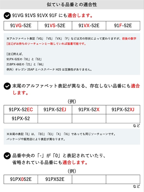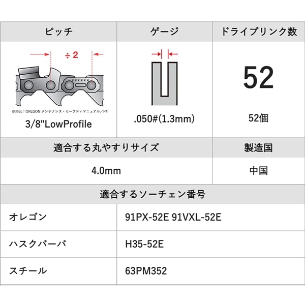 ピッチ 3/8"LowProfile ゲージ .050"(1.3mm) ドライブリンク数 52個 適合する丸やすりサイズ 4.0mm 製造国 中国 適合するソーチェン品番 オレゴン |91PX-52E 91VXL-52E ハスクバーナ|H35-52E S93G-52E スチール |63PM3-52 似ている品番との適合性(オレゴン) ●91VG 91VS 91VX 91Fにも適合します。 91VG-52E 91VS-52E 91VX-52E 91F-52E ※アルファベット表記「VG」「VS」「VX」「F」などは刃の形状によって変わりますが、前後の数字[注1]がお持ちのソーチェーンと一致していれば装着可能です。 [注1]例えば、 91PX-52Eの「91」と「52」 21BPX-66Eの「21」と「66」 例外)オレゴン25APとハスクバーナH25は互換性がありません。 ●末尾のアルファベット表記が異なる、存在しない品番にも適合します。 (例) 91PX-52EC 91PX-52EJ 91PX-52X 91PX-52XJ 91PX-52 など ※末尾の表記「E」は、「EC」「EJ」「X」「XJ」であっても同じソーチェーンです。 ●品番中央の「ー」が「0」と表記されていたり、省略されている品番にも適合します。 (例) 91PX052E 91PX52E など 【特長】 切り込んだ瞬間にワンランク上の切削性能を感じさせるソーチェーンです。キックバックを防ぐバンパードライブリンクを採用し、また、刃付け方法を改良したことにより、切削性能がアップ。 ●切れ味鋭く、キックバックが少ない ●振動が少なく、スーッと吸い込まれるような喰い込み ●パワーヘッドを意識させないシャープで滑らかな切れ味本製品はチェーンソー替え刃です。 下記のオレゴン、ハスクバーナ、スチールのソーチェーン品番に互換性があります。 ピッチ ゲージ ドライブリンク数 3/8"LowProfile .050"(1.3mm) 5252個 適合する丸やすりサイズ 製造国 4.0mm 中国 適合するソーチェン番号 オレゴン 91PX-52E 91VXL-52E ハスクバーナ H35-52E S93G-52E スチール 63PM3-52 似ている品番との適合性 91VG 91VS 91VX 91Fにも適合します。 91VG-52E 91VS-52E 91VX-52E 91F-52E ※アルファベット表記「VG」「VS」「VX」「F」などは刃の形状によって変わりますが、前後の数字[注1]がお持ちのソーチェーンと一致していれば装着可能です。 [注1]例えば、 91PX-52Eの「91」と「52」 21BPX-66Eの「21」と「66」 例外)オレゴン 25AP とハスクバーナ H25 は互換性がありません。 末尾のアルファベット表記が異なる、存在しない品番にも適合します。 (例) 91PX-52EC 91PX-52EJ 91PX-52X 91PX-52XJ 91PX-52 など ※末尾の表記「E」は、「EC」「EJ」「X」「XJ」であっても同じソーチェーンです。 パッケージや販売店により表記が異なります。 品番中央の「-」が「0」と表記されていたり、省略されている品番にも適合します。 (例) 91PX052E 91PX52E など