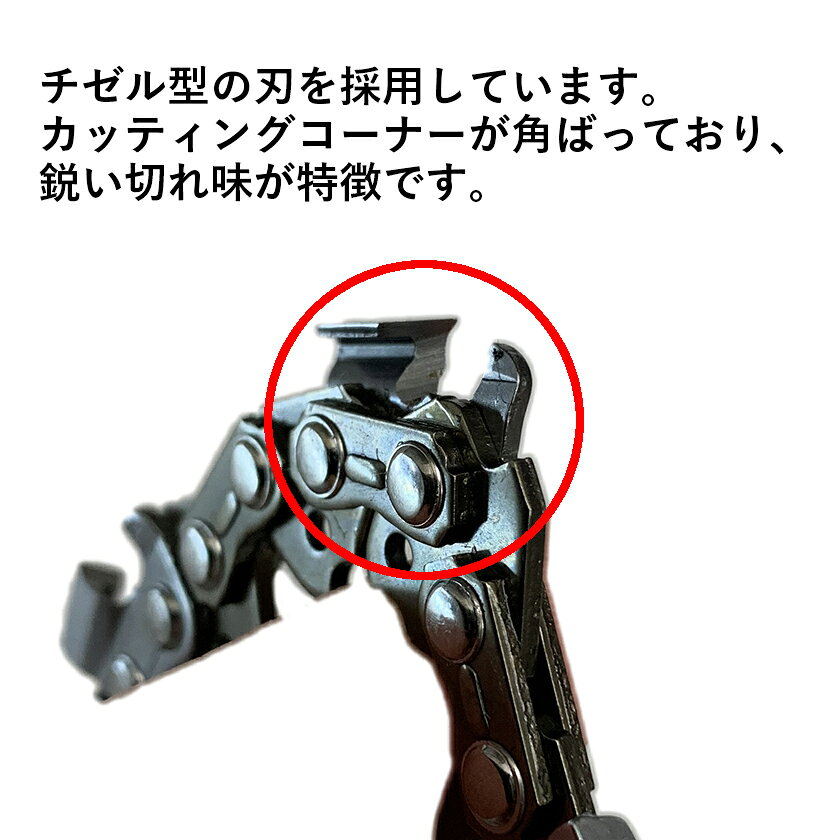 ■ 商品説明 ■当商品は当店オリジナル品(むとひろ製)です。チゼル型の刃(角刃)を採用しています。カッティングコーナーが角ばっており、鋭い切れ味と切削スピードの速さが特徴です。互換性があるソーチェーン品番:オレゴン: 21BPX-66E 21BPX66E 21BPX066E 21BPX066EC 21BPX066EJハスクバーナ: H25-66Eスチール: 25RM-66ピッチ:.325"ゲージ:.058"(1.5mm)ドライブリンク数:66適合丸やすりサイズ:4.8mm製造国:中国ゼノア ハスクバーナ スチール 共立 マキタ 新ダイワ リョービなどのチェンソーにお使いいただけます。機種により適合の替刃品番が異なりますので、お気軽にお問合せください。林業 造園業 土木建設業 障害木 間伐 剪定 薪作り ログハウス 製材 カービング に最適です。■ 発送詳細 ■送料は無料です。ご注文後、1?3営業日以内に発送いたします。配送料を節約し、よりお求めになりやすい価格でご提供できるよう、外箱は組み立てずに梱包します。以下いずれかの方法にて発送いたします。商品によってこちらで配送業者を選択するため、業者指定は承れません。*ゆうパケット・レターパック(日本郵便)/ネコポス(ヤマト運輸)配達まで1-5日程お時間を頂きます。ポスト投函で配達が完了します。予めご了承くださいませ。