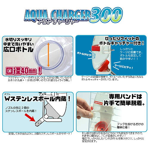 メーカー:三晃商会品番:B01たっぷりチャージ!!スッキリ洗える広口ボトル! 水切りスッキリ、中まで洗いやすい広口ボトルでお手入れ楽々。ケージにぴったりフィットして、ボトル設置が楽に出来るボトルキャッチャー付。三晃商会 SANKO アクアチャージャー 300対象うさぎ・フェレット・ハムスター・リス・モルモット・チンチラ等小動物機能小動物用給水ボトル特長●ボトルタンクの口が直径40mmと広く開いているのでお手入れも楽々!水切りが早いので入れ替えもイライラしません。 ●ケージへの設置が簡単で、ボトルへのいたずら防止にもなるボトルキャッチャーが付いています。 ●ノズルの先に2個のステンレスボールを内蔵し安定して水が出ます。 ●専用バンドは片手でカンタン脱着可能。幅広でしっかりしたバンドはボトルを傷つけにくくしっかりと安定させます。内容量300mlサイズ幅104×奥行き62×高さ150mm飲み口の直径:約10mm生産国中国材質ボトルタンク:PVC キャッチャー:PP ボトルキャップ:ABS ノズル部:ステンレス給水ボトルのトラブル防止のために1.ボトルを洗う おろしたての給水ボトルは、内部や部品が乾燥している為、水を入れてもキャップやノズルなどに空気が残った状態になりやすく、それが原因の水漏れがおこる場合があります。初めに、必ず”ボトルうがい”をするようにして下さい。 【ボトルうがいのしかた】 ・ボトルに水を半分位入れてキャップを締め、上下にジャブジャブと、ボトル内部とノズルキャップに水が全体に行き渡るように揺すります。(10〜20回) ・中の水を捨て、また半分入れて、2〜3回繰り返し充分に馴染ませます。 2.キャップをキチンと締める ボトルうがいの後は、飲み水でボトルを満水にし、ボトルキャップをしっかりと締めます。 この時、力任せに強く締めてしまうとボトルの変形の原因になり、かえって水漏れが起こる場合があります。ゆっくりと確実に、キャップが回らなくなるまでしっかりと締めましょう。 3.空気抜きをする キャップが締まったら、ノズルを設置角度と同じ体制にして、ノズル先を突付いて空気抜きをします。同時に飲み水が確実に出ているか確かめましょう。 ノズル先に空気が溜まっていると、水漏れの原因になったり、水が出てこない等のトラブルの元になります。 4.取り付けのコツ ・取り付け位置を少し高めの場所に設定します。下方に取り付けている場合、生き物が飲みづらくなるだけでなく、ノズルを押し上げようとする飲み方になり、ノズルの劣化を早めたり、ボトルが安定しなくなる場合があります。飲む時に、生き物が少し上を向く状態が良い位置です。 ・スプリング等でボトルを固定する場合は、あまり強く固定しないように注意をして下さい。締め付けすぎないように、ボトルが変形しない程度で固定するようにして下さい。 ・ボトルを設置した後、もう一度、ノズル先をトントンと突付き、空気抜きを行って下さい。ご注意※本品は、うさぎ・モルモット等の小動物用の給水器です。他の目的には使用しないでください。 ※取り付け後、ノズル先端から水が漏れていないか、生き物が水を飲めているか確認をしてください。 ※火気には近づけないでください。 ※直射日光が当たる場所や高温になる場所でのご使用はしないでください。 ※落下などの衝撃を与えますと本体が破損し、水漏れの原因になりますので、取り扱いは慎重に行ってください。 ※安定性が悪くなりますので、必ず付属のボトルキャッチャーとホルダーを使用してください。 ※使用中、異常を感じたら使用を中止してください。 ※使用状況により、樹脂部やノズル先端部が劣化・破損し水漏れが発生する場合がありますので早めにお取り替えください。 ※飼育時における、事故等に関しましては責任を負いかねますので、予めご了承ください。ハイペット パスチャーチモシー 450g 一番刈り うさぎ毎日の水分補給に エナジーラビット 70g 5g×14本包入り うさぎ ハムスター チンチラマルカン ウォーターボトル フラット 350ml 小動物 給水器三晃商会 アクアチャージャー 500 … horei_mtd_kyusui horei_hamri_kyusui horei_feret_kyusui _animal 小動物 鳥 小動物全般 水飲み器 三晃商会 AQUA CHARGER 300ml 20120210 YK sanko_ferret sankomizu0606mellmaga harine1902_dishbt sarb_miz satt_miz samr_miz safr_miz 吸水ボトル 水飲み 吸水 ボトル うさぎ フェレット ハムスター リス モルモット チンチラ opa2_stop y12m02 sancohinyariモルモットのはじめて飼育セット スターターセット スタートセット(81×50.5×55cm)うさぎケージ 三晃商会 うさぎの広いおうちセット 飼育説明書付き(81×50.5×55cm) うさぎ ケージ スターターセット三晃商会 フェレット飼育スタートセット(82×51×52.5cm) フェレット 飼育セット小動物の水分補給セット(アクアコール 5個セット+アクアチャージャー300)うさぎ・モルモット用 防災・避難グッズセット 網ケージキャリーver三晃商会 チンチラ基本飼育セット三晃商会 ファンシーラット基本飼育セット シャトルマルチ R70(
