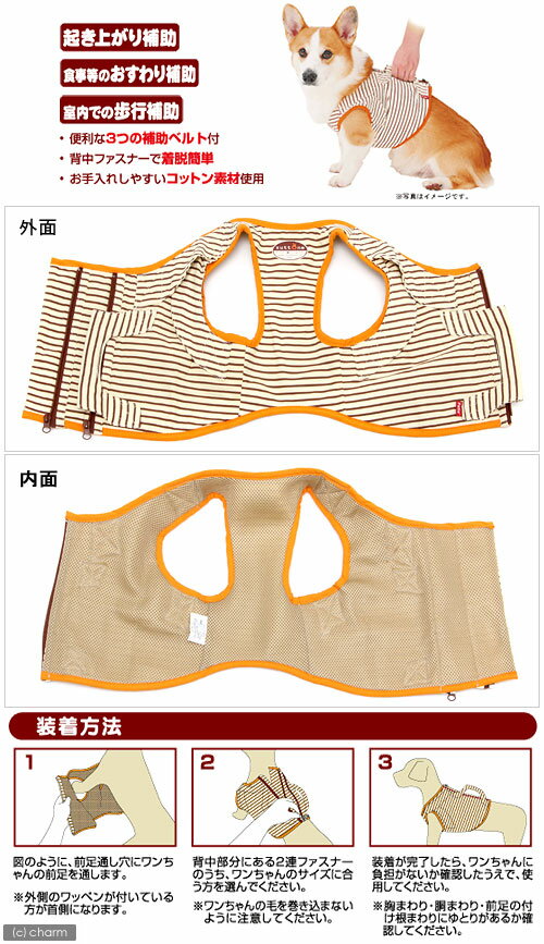 メーカー:ペティオ品番:W23638足腰の筋力が低下したときのサポート!ペティオ 老犬介護用 補助機能付ベスト 2L特長●便利な3つの補助ベルトで老犬の生活をサポート ・歩行補助ベルト ・お座り補助ベルト ・起き上がり補助ベルト ●背中ファスナーで脱着簡単 ●お手入れしやすいコットン素材使用 ●メッシュ素材で通気性抜群 ●抗菌消臭、手洗いOK適応犬種20kgまでの中型犬 例:ボーダーコリー、その他の中型犬 体重:20kgまで 胸まわり:55〜60cm 胴まわり:63〜67cm 前足まわり:〜45cm ※ご購入の際は必ずワンちゃんを実測のうえお買い求めください。ワンちゃんの測定方法胸まわり:前足つけ根の前から、一番太い部分 胴まわり:前足と後足の間を2等分した、前から一番太い部分 前足まわり:前足つけ根の部分装着方法1.前足通し穴にワンちゃんの前足を通します。 ※外側のワッペンが付いている方が首側になります。 2.背中にある2連ファスナーのうち、ワンちゃんのサイズに合う方を選んでください。 ※ワンちゃんの毛を挟まないようにご注意ください。 3.装着したらワンちゃんに負担がないか確認のうえで、使用してください。 ※胸まわり、胴まわり、前足つけ根まわりにゆとりがあるか確認いてください。正しい使い方●起き上がり補助 寝ている状態からフセの姿勢へ補助する場合は、横に寝ている状態で、上に重なっている方の前足の付け根と、床側の起き上がり補助ベルトを持ちます。前足をしっかりと支えながら、状態が起き上がるようにゆっくりと引き上げていきます。 フセの状態からおすわりの姿勢へ補助する場合は、左右両方の起き上がり補助ベルトを両手でしっかりと握り、ゆっくりと引き上げます。 ●おすわり補助 おすわり補助ベルトを両手でしっかりと握り、ゆっくりと後方に引き、ワンちゃんのふらつきを抑えます。 ※食事の補助を行うときは胸を圧迫しないように十分注意してください。 ●歩行補助 ワンちゃんの移動時のふらつきが気になる際に、歩行補助ベルトをしっかりと持ちふらつかないように支えてください。 ※ワンちゃんの歩行速度に合わせて進み、無理に引き上げすぎないように注意してください。原産国中国材質表地:綿100% 裏地:ポリエステル100% パイピング:綿100%お手入れ・保管方法●洗濯により色落ちする場合がありますので、他のものと一緒に洗濯しないでください。 ●洗濯機や乾燥機は使用しないでください。 ●汚れ等が気になる場合は、中性洗剤で軽く手洗いしてください。 ●漂白剤・ペンジン・シンナー・アルコール等は絶対に使用しないでください。 ●洗濯後はすぐに形を整えて陰干しし、完全に乾燥させてください。 ●直射日光・高温多湿の場所をさけて保管してください。ご注意※本品は犬用です。他の用途には使用しないでください。 ※事故防止のため、適応サイズ・適応体重以外の犬には使用しないでください。 ※使用前に破損箇所がないかを必ず確認してください。傷みが目立ち始めたら新しい製品に買い替えてください。 ※犬の健康状態を確認のうえ、使用してください。 ※万一、異常が見られた場合は直ちに使用を中止し、獣医師に相談してください。 ※首まわり、足の付け根まわり、胴まわりがしまり過ぎていないか、たえず点検してください。 ※犬が嫌がる場合は、無理に使用しないでください。 ※幼児・子供には使用させないでください。 ※火気や水気のそばでの使用や保管はしないでください。 ※幼児・子供・ペットのふれない所に保管してください。ペティオ 老犬介護用 歩行補助ハーネス 前足用 2Lペティオ 老犬介護用 歩行補助ハーネス 後足用 2L犬 おむつ ペティオ 老犬介護用 オムツパンツ 2L おもらし ペットペティオ 老犬介護用 床ずれ予防クッション ドーナツ型 大ペティオ 老犬介護用 床ずれ予防サポーター 中 … 犬用品 介護 看護 補助 ベスト ペティオ シニア犬 老犬 高齢犬 老齢犬 zuttone 中型犬用 20120314 YK 4903588236389Petio ヤマヒサ kaigo_vest ソフトハーネス YPKCHK_019 bnr_zutto_hokoubest ずっと一緒にいようね。 シニアライフサポート opa2_choku line2208petiodog■この商品をお買い上げのお客様は、下記商品もお買い上げです。※この商品には付属しません。■ペティオ 老犬介護用 歩行補助ハーネス 前足用 2Lペティオ 老犬介護用 歩行補助ハーネス 後足用 2L犬 おむつ ペティオ 老犬介護用 オムツパンツ 2L おもらし ペットペティオ 老犬介護用 床ずれ予防クッション ドーナツ型 大ペティオ 老犬介護用 床ずれ予防サポーター 中