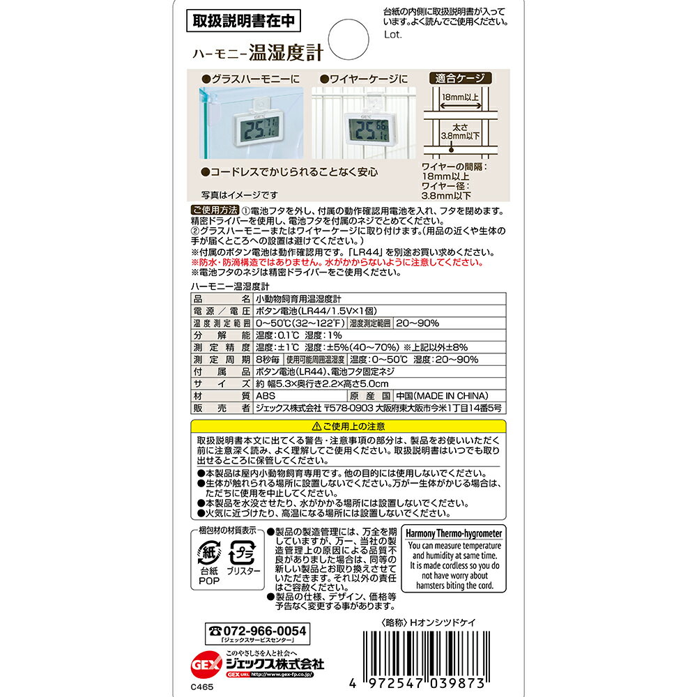 メーカー:ジェックス品番:66104快適な温度、湿度をチェック!GEX ハーモニーサーモ 温湿度計対象グラスハーモニー、一部のワイヤーケージ(ワイヤー間隔:18mm以上、ワイヤー径:3.8mm以下)特長●グラスハーモニー、一部のワイヤーケージ用の温湿度計です。●引っかけるだけで簡単に取り付けが可能です。●コードレスですので齧られることもなく安心です。セット内容本体ボタン電池(LR44)電池フタ固定ネジ仕様電源/電圧:ボタン電池(LR44/1.5V×1個)温度測定範囲:0−50℃湿度測定範囲:20−90%分解能:温度±1℃ 湿度±5%(40−70%)※上記以外±8%測定周期:8秒毎使用可能周囲温湿度:温度0−50℃ 湿度20−90%適合ワイヤーケージ:ワイヤー間隔18mm以上、ワイヤー径3.8mm以下サイズ(約)幅5.3×奥行き2.2×高さ5.0cm原産国中国ご注意※本品はペット用品です。目的以外の用途では使用しないでください。※防水、防滴仕様ではありません。水がかからないように注意してください。お問い合わせについて商品の不明点につきましては、下記にお問い合わせください。ジェックスサービスセンターTEL:072−966−0054GEX ハビんぐ グラスハーモニー360プラス(36.8×22.2×26.2cm) ハムスター ケージハムスターゲージ GEX グラスハーモニーマルチ300(31.4×30.7×30.0cm) ハムスター ケージGEX ハビんぐ グラスハーモニー300Cube ハビんぐフルセット(31.4×30.7×30.0cm) … gex heaterhon hamsterhoon minimal gex_harmony ハーモニーサーモ 温湿度計 4972547039873 20210224 GBNM y21m02 小動物 ハムスター グラスハーモニー ワイヤーケージ ケージ 温度計 湿度計 Harmony ジェックス ゲックス gex_all_care opa2_choku 温度管理 horei_usagi_youhinGEX ハビんぐ グラスハーモニー300Cube ハビんぐフルセット(31.4×30.7×30.0cm)飼育セット GEX グラスハーモニー 450N(47×31×28.2cm) ハムスター ケージ飼育セット GEX グラスハーモニー 600N(58×39.2×40cm) ハムスター ケージ■この商品をお買い上げのお客様は、下記商品もお買い上げです。※この商品には付属しません。■GEX ハビんぐ グラスハーモニー360プラス(36.8×22.2×26.2cm) ハムスター ケージハムスターゲージ GEX グラスハーモニーマルチ300(31.4×30.7×30.0cm) ハムスター ケージGEX ハビんぐ グラスハーモニー300Cube ハビんぐフルセット(31.4×30.7×30.0cm)