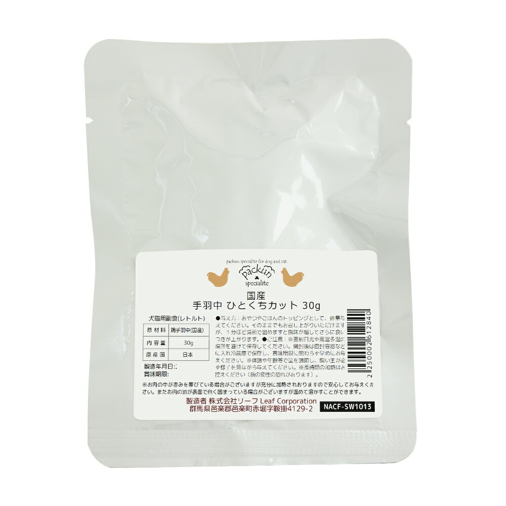 メーカー:(株)リーフ Leaf Corp品番:▼割▼無添加・無着色・保存料不使用。皮つきなので食いつき抜群。食べ盛りのコのごはんのトッピングに!国産 手羽中 ひとくちカット 30g 少量パック 無添加無着色レトルト 犬猫用 Packun Specialite対象犬・猫機能副食・おやつライフステージオールステージ(生後6ヶ月以上)特長●皮つきなので食いつき抜群。骨は除去済。軟骨が残っている場合がありますが、柔らかいので食べられます。●フードにトッピングして食いつきアップ、または手作りごはんの材料のひとつとしてなど、様々な用途でお楽しみいただけます。●無添加・無着色・保存料不使用。味付けはしておりませんので無塩です。素材本来の味をお楽しみください。●30gの食べきりサイズで開けたての美味しさを味わえます。内容量30g原材料手羽中(国産)原産国日本与え方●愛犬・愛猫のおやつやごはんのトッピングとして、少量与えてください。●そのままでもおいしくお召し上がりいただけますが、1分ほど湯煎で温めますと、風味が増してさらに食いつきが上がります。保存方法●直射日光や高温多湿の場所を避けて保存してください。 ●開封後は密封容器などに入れ、冷蔵庫で保存し、消費期限に関わらず早めにお与えください。 ご注意※6ヶ月未満の幼犬・幼猫には与えないでください。※袋の中の水分は素材から出たおいしいスープです。素材と一緒にお楽しみください。 ※天然素材なので、形・色合いに多少のバラつきがあります。 ※本品を与える際は、喉に詰まらせないよう様子を見ながら与えてください。 ※本品は保存料を使用しておりません。消費期限内でも保管状況によっては、カビが発生する場合がございます。開封後はお早めにお与えください。 ※風通しの良い、直射日光があたらない涼しいところで保管してください。※長時間の加熱はお控えください(ビニール袋の変性の恐れがあります)。 犬 おやつ 国産 うす〜くスライスして焼いた ハーブで育った鶏ささみジャーキー 30g 犬猫用 PackunxCOCOA国産 しっとりやわらか ハーブで育った鶏ささみのジャーキー細切り はちみつ味 50g 犬猫用おやつ国産 カツオ ひとくちころころキューブ 60g 無添加無着色レトルト 犬猫用 Packun Specialite … リーフコーポレーション リーフコーポ リーフ LEAF Corp ぱっくん スペシャリテ _dog _neko usymsetlist pkn_retort 10set ckn kowake 国産 try_pco 無添加 無着色 犬用おやつ 手作り 厳選素材 鶏 鳥 おやつ 犬フード ドッグフード トッピング PACKUN_COCOA packuncocoaseries れとると ウェットフード ウェット 手づくり ごはん ご飯 食いつき 食欲 シニア シニア犬 高齢犬 食が細い 小食 少食 グルメ 超小型犬 小型犬 中型犬 大型犬 猫 ひと口 30g コラーゲン にこごり 手羽中 20210510 MI opa2_yoko10mi28 nyannyan23yuzupi 202304leafrakudgcoupon ntdchra y21m05 pus2403leaf04 pus2403leaf03 usatotal pus2412leaf04 pus2503leaf05 leaf04tk04国産 手羽中 ひとくちカット 30g 少量パック 無添加無着色レトルト 犬猫用 Packun Specialite構成する商品内容は在庫状況により予告無く変更になる場合がございます。予めご了承下さい。■この商品をお買い上げのお客様は、下記商品もお買い上げです。※この商品には付属しません。■犬 おやつ 国産 うす〜くスライスして焼いた ハーブで育った鶏ささみジャーキー 30g 犬猫用 PackunxCOCOA国産 しっとりやわらか ハーブで育った鶏ささみのジャーキー細切り はちみつ味 50g 犬猫用おやつ国産 カツオ ひとくちころころキューブ 60g 無添加無着色レトルト 犬猫用 Packun Specialite