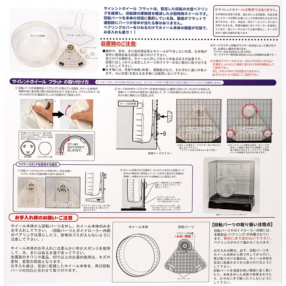 メーカー:三晃商会品番:U47ベアリングシステム採用のとっても静かなホイール!三晃商会 SANKO サイレントホイール フラット40対象チンチラ、プレーリードッグ、ハリネズミなど特長●大径ベアリングシステムを採用した、とても静かなホイールです。●軸が背中に当たらず、奥行きも広く足元もフラットです。●ホイール径40cmの超巨大サイズで、チンチラ、プレーリードッグ、ハリネズミなどの小動物に対応します。●ベアリング部とホイールがワンタッチで着脱可能ですので、丸ごと水洗いするなどメンテナンスも楽に行えます。●回転パーツで荷重を分散させることにより、ケージワイヤーへの負担を軽減しました。●ヨコ線、タテ線、メッシュとあらゆるケージワイヤーに取り付けが可能です。●付属のワイヤースタンドによる床への取り付けも可能です。セット内容ホイールワイヤースタンド回転パーツロックナット(大)ロックナット(小)×2仕様対応ケージ:ワイヤー直径4mmまで、ワイヤー間隔約20mm以上サイズ(約)ホイール:直径400×幅155mmワイヤースタンドからホイールまで:185mm材質PS、ABS、スチール原産国中国ご使用方法●ケージに取り付ける場合1.回転パーツの金属部分(ベアリング)が見えている側を、ホイール本体の背面中央にある受け部にはめてから、ベアリングカバーをロックがかかる(最後まで)しっかり回転させて固定します。2.ケージの中のケージワイヤーが太めで安定した場所に向かって、ロックナットを外した回転パーツのボルト部を外に突き出して、ケージの外側から大小3ヶ所のロックナットをボルト部に締めこんで固定します。※スタンドがしっかりと床に付かなかったり、ロックナットがすべて取り付けできない時はワイヤースタンドは使用しません。●ワイヤースタンドを使用する場合1.回転パーツからロックナットを取り外し、所定の溝にワイヤースタンドをボルトの爪の後ろにはまるようにします。※ワイヤースタンドは、床に着く部分が正面に出っ張るように取り付けます。2.ホイールを取り付ける場所に、ロックナットを外した回転パーツのボルト部を外に突き出して、ケージの中に取り付ける場合と同様に、外側からロックナットを締め込んで固定します。※必ず荷重を支えられる場所に回転パーツをロックナットで固定してください。※ワイヤースタンドが安定した床面にぴったりとついて重心を支えている状態にしてください。※スタンドが浮き上がらないように、床に着けて置いてください。ホイールが揺れた時に床から離れないようにしてください。ご注意※本品は小動物用品です。目的以外の用途では使用しないでください。※回転パーツやガイドローラー内部には、金属部品(ベアリング)が内蔵されています。絶対に水で洗わないでください。サビが発生して、回りが悪くなったり動かなくなる場合があります。※複数の生き物がいる場所(多頭飼いなど)では使用しないでください。※ベアリングの構造上、ホイールのブレに若干のバラつきがあります。※無音ではありません(従来のホイールに比べて回転時に発生する音が静かなホイールです)。※生き物の生活音や若干の回転音、また、サイレントホイールをケージに固定する場合にケージ部分が揺れることによって発生する音に関しましては、ご容赦いただきますようお願いいたします。三晃商会 イージーホーム 80 ハイ(81×50.5×84cm)小動物 ケージ リス チンチラ デグー三晃商会 サニーメイド カボチャ 20g三晃商会 北海道ソフトチモシー 600g三晃商会 北海道ファーストチモシー 600gfuu 陶器四角いエサ入れ いちご ハムスター チンチラ デグーチンチラ 完全飼育 … 三晃商会 SANKO サイレントホイール フラット40 4976285304705 _animal 小動物 小動物用品 デグー degu チンチラ chinchilla ハリネズミ 20210618 y21m06 GBNM プレーリードッグ 回し車 ホイール おもちゃ 玩具 その他 その他の動物 Silent Wheel Flat U47 U−47 大きめ 静音 2107p5rmss TOY 静か 音がしない おおきめ 大 silentwheelflat opa2_stop三晃商会 チンチラ基本飼育セット■この商品をお買い上げのお客様は、下記商品もお買い上げです。※この商品には付属しません。■三晃商会 イージーホーム 80 ハイ(81×50.5×84cm)小動物 ケージ リス チンチラ デグー三晃商会 サニーメイド カボチャ 20g三晃商会 北海道ソフトチモシー 600g三晃商会 北海道ファーストチモシー 600gfuu 陶器四角いエサ入れ いちご ハムスター チンチラ デグーチンチラ 完全飼育