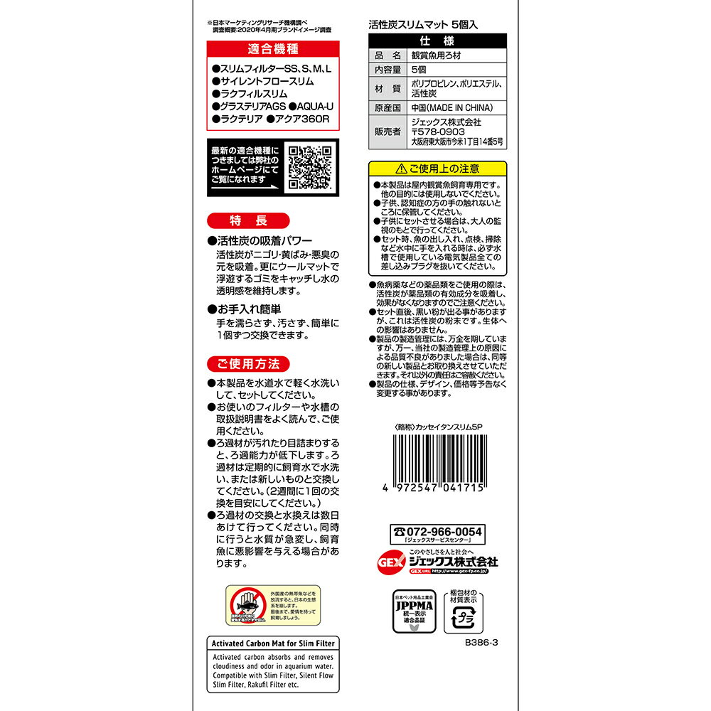 メーカー:ジェックス交換用フィルター!GEX 活性炭スリムマット 5個入り N対象スリムフィルターSS/S/M/L、スリムフィルターDCーX SS1/S2/M3/L4、サイレントフロースリム、ラクフィルスリム、グラステリアAGS SLIDE OF230、グラステリアAGS OF230、グラステリアAGS OF450、アクア360R、ラクテリア、AQUA−U、AQUA−U WIDE、グラスアクアPerco、PERCO B−Dark Wood特長●活性炭がニゴリ・黄ばみ・悪臭の元を吸着し、ウールマットで浮遊するゴミをキャッチするマットです。 ●手を濡らさず、汚さず、簡単に交換できます。数量5個材質ポリプロピレン、ポリエステル、活性炭原産国中国ご注意※本品GEXの交換用フィルターです。他の目的では使用しないでください。 ※魚病薬などの薬品をご使用の際は、活性炭が薬品類の有効成分を吸着し、効果がなくなりますのでご注意ください。お問い合わせについて商品の不明点につきましては、下記にお問い合わせください。ジェックスサービスセンターTEL:072−966−0054GEX サイレントフロースリム ホワイトSP 水中フィルター 〜25L以下水槽GEX サイレントフロースリム ブラックSP 水中フィルター 〜25L以下水槽GEX 水中フィルター ラクフィルスリム ブラック 26L以下水槽用 水換え簡単GEX 水中フィルター ラクフィルスリム ホワイト 26L以下水槽用 水換え簡単 … GEX 活性炭スリムマット 5個入り N 4972547041715 20220228 y22m02 ytks アクアリウム アクアリウム用品 交換用マット 交換用 マット ろ過材 ろ過 吸着 活性炭 ウールマット にごり 濁り 黄ばみ 悪臭 簡単 交換 ジェックス 22gnewaqua line240109aquark opa2_choku熱帯魚がすぐに飼える水槽セット! アクロ30キューブN GEX スリムフィルターDC−X M3+ヒーター付き 8点セット 交換ろ材付き【送料無料】GEX 活性炭スリムマット 5個入り×6 N■この商品をお買い上げのお客様は、下記商品もお買い上げです。※この商品には付属しません。■GEX サイレントフロースリム ホワイトSP 水中フィルター 〜25L以下水槽GEX サイレントフロースリム ブラックSP 水中フィルター 〜25L以下水槽GEX 水中フィルター ラクフィルスリム ブラック 26L以下水槽用 水換え簡単GEX 水中フィルター ラクフィルスリム ホワイト 26L以下水槽用 水換え簡単