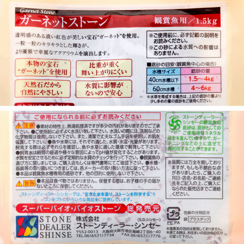 メーカー:シンセー本物の宝石“ガーネット”を使用!シンセー ガーネットストーン 1.5kg対象淡水・海水両用特長●透明感のある濃い紅色をした美しい宝石「ガーネット」を使用しています。 ●一粒一粒キラキラとした輝きが、より優雅で華麗なアクアリウムを演出します。 ●100%天然の石を使用したお魚に優しい砂です。 ●比重が重く舞い上がりにくいです。 ●熱湯処理済みです。この砂による水質への影響ないので安心です。 内容量1.5kg粒サイズ(約)約1mm※サイズには多少のバラつきがあります。ご了承ください。ご注意※ご使用の前には必ず裏面の説明をお読みください。 ※素材の特性上熱湯処理済みですが、多少の汚れがありますので予めご了承ください。 ※ご使用前に必ず水洗いをしてください。水洗いの際には洗剤などの化学物質は使用しないでください。また、清潔で丈夫なゴム手袋を使用し、お肌を保護してください。※本品は天然素材の為、採取時期・採取場所の違いにより多少の色目の変化がございます。予めご了承下さい。※本製品は食べ物ではございません。保管する際にはお子様等の手が届かないところに保管して下さい。お問い合わせについて商品の不明点につきましては、下記にお問い合わせください。株式会社 ストーンディーラー・シンセーTEL:06−6571−7734シンセー ガーネットストーン 500gシンセー 本五色石 1.5kgシンセー 津軽プレミアム 1.5kg … シンセー ガーネットストーン 1.5kg 4900149112014 20220715 y22m07 mura アクアリウム アクアリウム用品 _aqua _gardening アクア用品 砂 アカ ガーネット ガーネットサンド 宝石 ストーンディーラーシンセ ストーン ディーラー シンセ STONE DEAKER SHINSE 底砂 KEIRYOU 底床 砂利 観賞魚 淡水 海水■この商品をお買い上げのお客様は、下記商品もお買い上げです。※この商品には付属しません。■シンセー ガーネットストーン 500gシンセー 本五色石 1.5kgシンセー 津軽プレミアム 1.5kg
