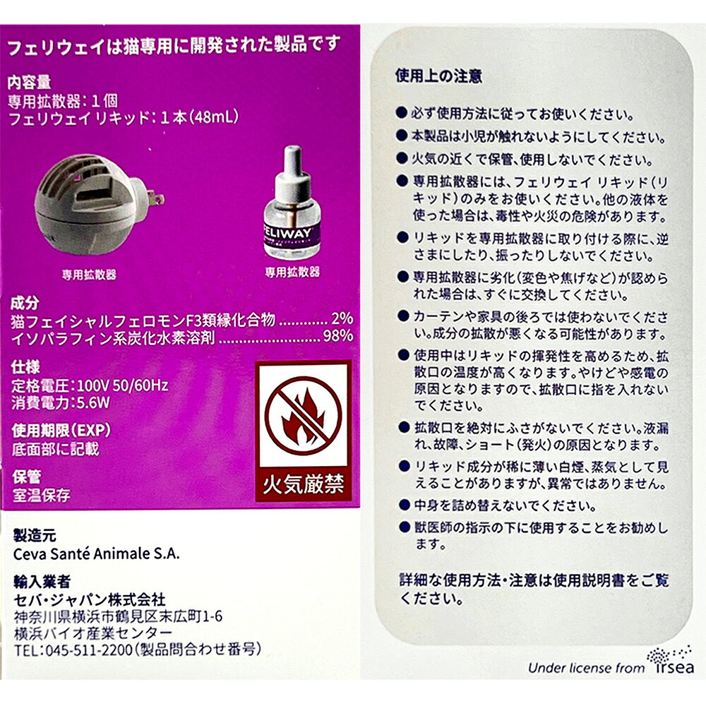 メーカー:セバ・ジャパンフェイシャルフェロモンF3拡散器!フェリウェイ 専用拡散器+リキッド48ml対象猫特長●世界中で広く愛用されている、猫のフェイシャルフェロモンF3類縁化合物の拡散器です。 ●フェイシャルフェロモンF3類縁化合物は猫の頬から分泌され、猫が生活環境内にある物、人、他の動物などに慣れ親しんでいることを示すためにこすりつけるものです。 ●フェリウェイリキッドボトル48mlが付属します。セット内容専用拡散器×1 フェリウェイリキッドボトル×1仕様定格電圧:100V 50/60Hz共用 消費電力:5.6W成分猫フェイシャルフェロモンF3類緑化合物:2%、イソパラフィン系炭化水素溶剤:98%生産国フランスご使用方法●猫がよく過ごす部屋に1個設置してください。 ●1本48mlで最大30日持続し、70平方メートルまでカバーします。 ●ボトルのキャップを回し、ゆっくり真上に引き抜いてください。芯棒は折れることがありますので、丁寧にお取り扱いください。 ●ボトルの芯棒が専用拡散器の穴に、下から垂直に入るようにセットしてください。その際芯棒が専用拡散器に触れないようにしてください。 ●必ずボトルを下側にして、専用拡散器のプラグを壁のコンセント(家庭用100Vの電源)にしっかりと奥まで差し込んでください。しばらくすると成分が拡散し始めます。ご注意※本品はペット用品です。目的以外の用途では使用しないでください。 ※ご使用に際して、延長コードなどは使用しないでください。 ※最善の状態でご利用いただくため、30日間の仕様を目途にリキッドを交換してください。 ※専用拡散器は6ヶ月間の使用ごとに新しいものに交換してください。お問い合わせについて商品の不明点につきましては、下記にお問い合わせください。 セバ・ジャパン株式会社 TEL:045−511−2200フェリウェイ リキッド 48mlフェリウェイ スプレー 60mlアウトレット品 ワタオカ ねこじゃすり グレー ブラシ 正規品 訳ありキャティーマン なで猫しゃもじ … メーカー画像 フェリウェイ 専用拡散器+リキッド48ml 3411110012499 20221011 y22m10 mura 猫用品 猫 ねこ 猫用 ねこ用 フェロモン フェイシャルフェロモンF3類縁化合物 フェイシャルフェロモン F3 FELIWAY スプレー 専用 拡散器 DNG_CHK■この商品をお買い上げのお客様は、下記商品もお買い上げです。※この商品には付属しません。■フェリウェイ リキッド 48mlフェリウェイ スプレー 60mlアウトレット品 ワタオカ ねこじゃすり グレー ブラシ 正規品 訳ありキャティーマン なで猫しゃもじ