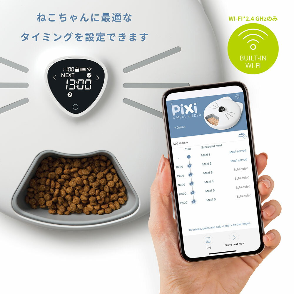 メーカー:ジェックス品番:57600アプリで操作できる猫用スマート自動給餌器、ドライ・ウェット・おやつ等、ねこちゃんのお好みに合わせてカスタマイズ!Catit Pixi スマート 6ミールフィーダー対象猫特長●アプリで操作できるリモートコントロール可能な猫用スマート自動給餌器です。●Catit Pixi スマート6ミールフィーダーはドライ・ウェット・おやつなど様々な種類のフードに対応。●ねこちゃんのお好みに合わせて1日最大6回(6種類)の食事回数を設定できます。●好きなドライフード、ウェットフードやおやつを適量トレイに入れておくだけで、フィーダーはアプリで設定したスケジュール通りに食事を提供してくれます。●専用のPixiアプリ(無料)と本体で愛猫の食事をスケジュール管理。●トレイは1食ごとに回転します。早食いや食べ過ぎを防ぐために、分けて与えることが出来ます。●盗み食いを防止する、ロック機能と操作パネルロック機能付き。●回転時に障害物にあたると停止する、キャットセーフ機能付き。●操作パネルでも給餌設定可能(タッチパターンでロック解除可能)。●トレイは簡単に取り外して丸洗い可能。●トレイの下に付属のアイスパックを入れると、フードの鮮度を保つことが出来ます。●別売のCatit Pixi スマート 6ミールフィーダー用アイスパックを追加すると、交互に凍らせて使用でき便利です。●バックアップ電源として乾電池(別売)を使用できます。(単2乾電池×4本)セット内容本体×1電源コード×1USBアダプター×1アイスパック×1セットサイズ(約)幅32×奥行34.5×高さ9.2cm(コード長:1.1m)仕様●最大容量:約170mL×6●定格電圧/周波数:AC100V 50/60Hz●定格消費電力:作動時:1.1W、待機時:0.7W●USBアダプター:入力:AC100−240V、出力:DC5V 1.0A●電気代:1ヶ月約13.6円(50Hz/1kWh 27円の場合※待機時)生産国中国ご注意※本品は猫用の自動給餌器です。目的以外の用途では使用しないでください。猫 給水器 Catit(キャットイット) Pixi スマート ファウンテン自動給餌器 Catit(キャットイット) Pixi スマート フィーダーCatit(キャットイット) Pixi スマート 6ミールフィーダー用アイスパックペットカメラ Catit(キャットイット) Pixi スマート マウスカメラ猫 おもちゃ Catit(キャットイット) Pixi スピナー シルバー猫 おもちゃ Catit(キャットイット) Pixi スピナー ブルーキャットタワー Catit(キャットイット) Vesper キャッスル猫 ハウス Catit(キャットイット) Vesper ロケット猫 おもちゃ Catit(キャットイット) Vesper トンネル給水器 Catit(キャットイット) Pixi ファウンテン ホワイト給水器 Catit(キャットイット) Pixi ファウンテン グリーン給水器 Catit(キャットイット) Pixi ファウンテン ブルー給水器 Catit(キャットイット) Pixi ファウンテン ピンク給水器 交換フィルター Catit(キャットイット) Pixi ファウンテン 交換フィルター3個入給水器 交換用パーツ Catit(キャットイット) Pixi ファウンテン ステンレストップ猫 爪とぎ Catit(キャットイット) Pixi スクラッチャーTall猫 爪とぎ Catit(キャットイット) Pixi スクラッチャーWide猫 爪とぎ Catit(キャットイット) Pixi スクラッチャーCat Tail … GEX Catit Pixi スマート 6ミールフィーダー 4972547927583 猫 ねこ 猫用品 成猫 高齢猫 シニア シニア猫 老猫 給餌器 自動給餌器 餌やり器 フードストッカー アプリ 遠隔操作 アプリ管理 かわいい おしゃれ 静音 超静音 静香 スマートシリーズ スマート家電 ジェックス20230222 kak キャットイット キャット イット ピクシー bnr2304catite bnr2404catite■この商品をお買い上げのお客様は、下記商品もお買い上げです。※この商品には付属しません。■猫 給水器 Catit(キャットイット) Pixi スマート ファウンテン自動給餌器 Catit(キャットイット) Pixi スマート フィーダーCatit(キャットイット) Pixi スマート 6ミールフィーダー用アイスパックペットカメラ Catit(キャットイット) Pixi スマート マウスカメラ猫 おもちゃ Catit(キャットイット) Pixi スピナー シルバー猫 おもちゃ Catit(キャットイット) Pixi スピナー ブルーキャットタワー Catit(キャットイット) Vesper キャッスル猫 ハウス Catit(キャットイット) Vesper ロケット猫 おもちゃ Catit(キャットイット) Vesper トンネル給水器 Catit(キャットイット) Pixi ファウンテン ホワイト給水器 Catit(キャットイット) Pixi ファウンテン グリーン給水器 Catit(キャットイット) Pixi ファウンテン ブルー給水器 Catit(キャットイット) Pixi ファウンテン ピンク給水器 交換フィルター Catit(キャットイット) Pixi ファウンテン 交換フィルター3個入給水器 交換用パーツ Catit(キャットイット) Pixi ファウンテン ステンレストップ猫 爪とぎ Catit(キャットイット) Pixi スクラッチャーTall猫 爪とぎ Catit(キャットイット) Pixi スクラッチャーWide猫 爪とぎ Catit(キャットイット) Pixi スクラッチャーCat Tail