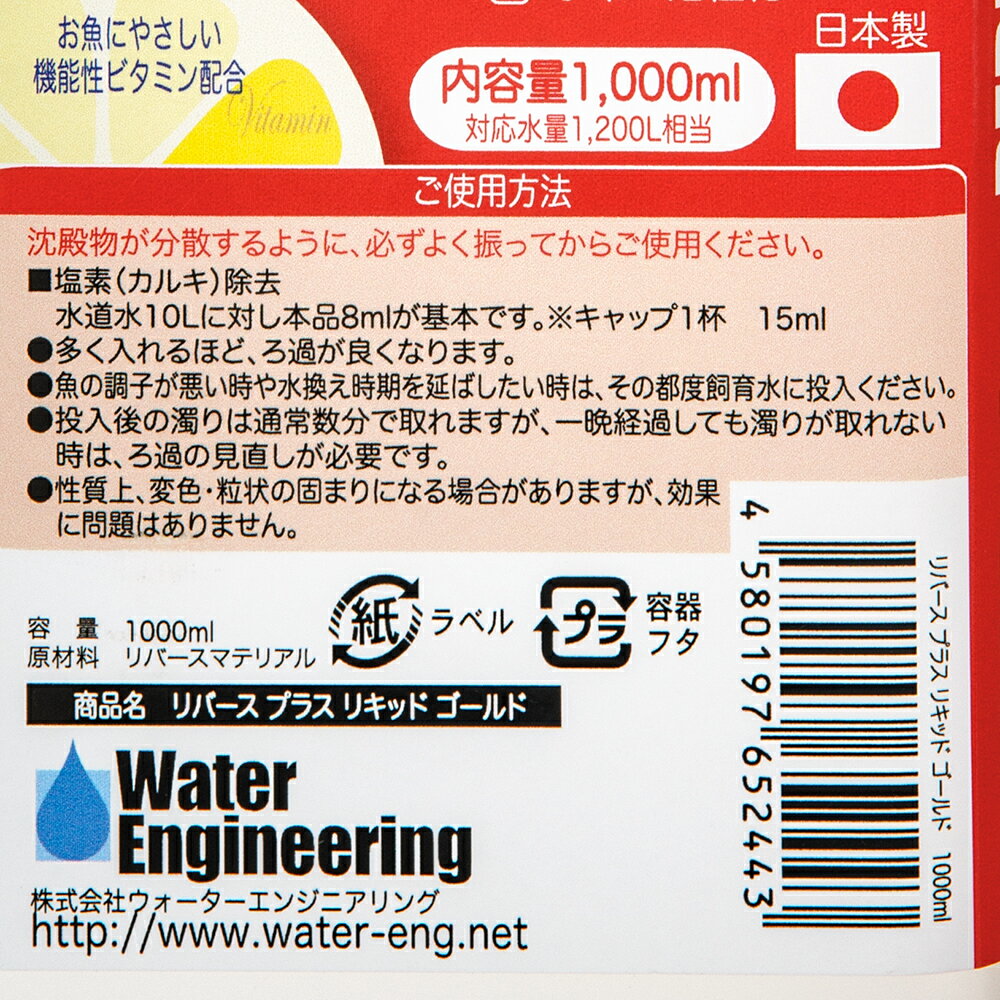 メーカー:ウォーターエンジニアリング大切な金魚の為のカルキ抜き!リバース リバース+リキッドゴールド 1,000mL対象金魚特長●イオン吸着と機能性ビタミンにより最も安全にカルキを初めとした水道水の有害物質を除去します。●金魚が口にすることで転覆の要因といわれる物質を除去します。●飼育水の汚れ物質を除去して水を長持ちさせ、コケも出にくくなります。●濁り物質を除去し、透明度を高めます。●汚れを分解するバクテリアが定着しやすく活動的になります。内容量1000mL原材料リバースマテリアル生産国日本ご使用方法沈殿物が分散するように、必ずよく振ってからご使用ください。●カルキ除去水道水10Lに対し本品8mLが基本です。※キャップ1杯 5mL●多く入れるほど、ろ過が良くなります。●魚の調子が悪い時や水替え時期を延ばしたいときは、その都度飼育水に投入してください。●投入後の濁りは通常数分で取れますが、一晩経過しても濁りが取れない場合は、ろ過の見直しが必要です。●性質上、変色・粒状の固まりになる場合がありますが、効果に問題ありません。ご注意※本品は金魚用カルキ抜きです。対象以外には使用しないでください。コメット らんちゅうの主食 納豆菌 沈下 小粒 90g 金魚の餌JCTアクア すみあられ 水質改善材 … リバース・リキッド+ ゴールド 1000mL 4580197652443 ウォーターエンジニアリング アクア用品 アクアリウム 金魚 カルキ除去 コケ キンギョ ろ過 転覆 予防 バクテリア 除去 琉金 ランチュウ 地金 ナンキン ピンポンパール 出目金 福だるま 和金 リキッド プラス リバースリキッド カルキ抜き 塩素 Cl watereglkid カルキ抜 カルキ amo 20230417■この商品をお買い上げのお客様は、下記商品もお買い上げです。※この商品には付属しません。■コメット らんちゅうの主食 納豆菌 沈下 小粒 90g 金魚の餌JCTアクア すみあられ 水質改善材
