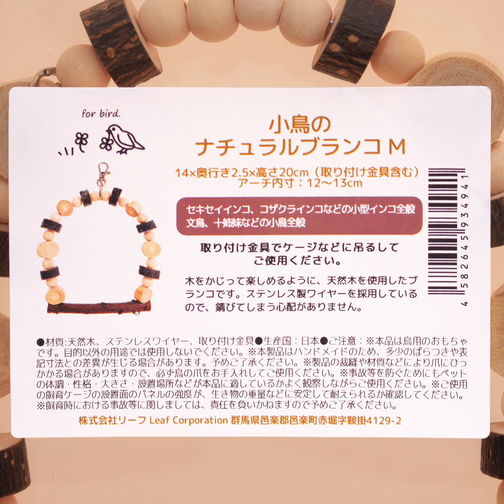 メーカー:(株)リーフ Leaf Corp※本品はパッケージリニューアル中です。画像・説明文とは異なるリニューアル前のパッケージのお届けとなる場合がございます。ご了承ください。天然木を使用したナチュラルブランコ!小鳥のナチュラルブランコ M対象セキセイインコ、コザクラインコなどの小型インコ全般 文鳥、十姉妹などの小鳥全般特長●止まり木部分に天然木を使用したナチュラルなブランコです。 ●木をかじっても楽しめるよう天然木を使用しています。 ●ステンレス製のワイヤーを採用しているので、錆びてしまう心配もありません。数量1個サイズ(約)幅14×奥行き2.5×高さ20cm(取り付け金具含む) とまり木部分直径1cm〜1.5cm アーチ内寸:12〜13cm ※ハンドメイドの為、表記寸法と若干の差異が生じる場合があります。材質天然木、ステンレスワイヤー、取り付け金具ご注意※本品は鳥用のおもちゃです。目的以外の用途では使用しないでください。※本製品はハンドメイドのため、多少のばらつきや表記寸法との差異が生じる場合があります。予めご了承ください。※製品の裁縫や材質などにより爪にひっかかる場合がありますので、必ず鳥の爪をお手入れしてご使用ください。※事故等を防ぐためにもペットの体調・性格・大きさ・設置場所などが本品に適しているかよく観察しながらご使用ください。※ご使用の飼育ケージの設置面のパネルの強度が、生き物の重量などに安定して耐えられるか確認してください。※飼育時における事故等に関しましては、責任を負いかねますので予めご了承ください。 小鳥のレザーフラワー ヌメ革 インコ おもちゃ ハンドメイド小鳥のおもちゃ 3点セット ナチュラルシリーズ バードトイ おもちゃ小鳥の松ぼっくりとくるみのナチュラルトイ ハンドメイド バードトイ おもちゃ小鳥のわくわく輪投げ ハンドメイド インコ おもちゃ小鳥の爪とぎ用 備長炭ブランコ ハンドメイド 色おまかせ バードトイ おもちゃ鳥さんの食事 昆虫食サポート ミルワームソフト 30g おやつLeaf オリジナルデザイン かくれんブランコ 小鳥のお家 セキセイインコ コザクラインコ 小型インコLeaf オリジナルデザイン バードテント S 小鳥のお家 セキセイインコ コザクラインコ 小型インコLeaf オリジナルデザイン バードテント 角型 小鳥のお家 セキセイインコ コザクラインコ 小型インコLeaf オリジナルデザイン 小鳥のハンモック S セキセイインコ コザクラインコ 小型インコLeaf オリジナルデザイン 小鳥のハンモック M セキセイインコ コザクラインコ 小型インコ … リーフコーポレーション リーフコーポ リーフ LEAF Corp hwlist 楽しい キュー 鳥 トリ 用品 吊り下げ 布 ハンドメイド 手作り necoyama工房 おもちゃ 玩具 天然素材 バードトイ インコ セキセイインコ セキセイ 小型インコ hwhmlist 小鳥のナチュラルブランコ 小 ブランコ 木材 木 天然木 リンゴの木 4582645934941 ブンチョウ 文鳥 十姉妹 ジュウシマツ 小鳥全般 20230801 kszk y23m08 pus2506leaf04■この商品をお買い上げのお客様は、下記商品もお買い上げです。※この商品には付属しません。■小鳥のレザーフラワー ヌメ革 インコ おもちゃ ハンドメイド小鳥のおもちゃ 3点セット ナチュラルシリーズ バードトイ おもちゃ小鳥の松ぼっくりとくるみのナチュラルトイ ハンドメイド バードトイ おもちゃ小鳥のわくわく輪投げ ハンドメイド インコ おもちゃ小鳥の爪とぎ用 備長炭ブランコ ハンドメイド 色おまかせ バードトイ おもちゃ鳥さんの食事 昆虫食サポート ミルワームソフト 30g おやつLeaf オリジナルデザイン かくれんブランコ 小鳥のお家 セキセイインコ コザクラインコ 小型インコLeaf オリジナルデザイン バードテント S 小鳥のお家 セキセイインコ コザクラインコ 小型インコLeaf オリジナルデザイン バードテント 角型 小鳥のお家 セキセイインコ コザクラインコ 小型インコLeaf オリジナルデザイン 小鳥のハンモック S セキセイインコ コザクラインコ 小型インコLeaf オリジナルデザイン 小鳥のハンモック M セキセイインコ コザクラインコ 小型インコ