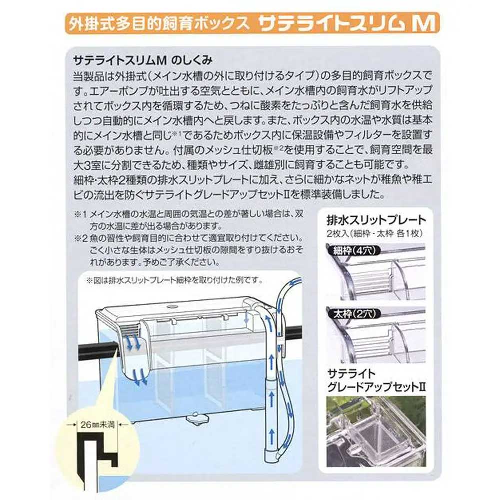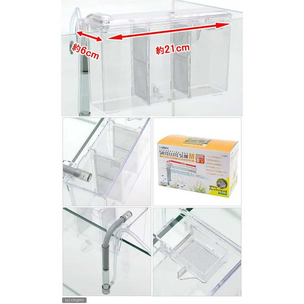 メーカー:スドー品番:S-5904簡単便利な飼育ボックス!スドー サテライトスリムM+グレードアップセット対象小型熱帯魚、ビーシュリンプ、メダカなど【適応水槽】・フレームレス水槽:ガラス厚が5mm以上の水槽。・フレーム付水槽:フレーム幅が26mm未満の水槽。※取り付ける部分の直線が21cmに満たないもの、高さが15cm以下の水槽や不安定な水槽、プラケースには取り付けることができません。※当製品はメイン水槽に掛けて使用します。単体では使用できません。セット内容スドー サテライトスリムM×1《セット内容》●カバー●メッシュ仕切板 2個●グレードアップセットII(ホルダー 1個、ネット 2個)●排水スリットプレート(細枠・太枠 各1個)●ボックス●パラレルアジャスター●エアーボリューム●吐出口キャップ●L字パイプ●給水パイプ●ストレートパイプ●Oリング●ストレーナー●エアーチューブ(30cm)スドー グレードアップセット×1特長【サテライトスリムM】●シュリンプ類、小型熱帯魚、仔魚や弱い魚の飼育にお勧めです。●水合わせ用のボックスにも使用いただけます。●外掛け式で、メイン水槽が広々使用でき、メンテナンス性に優れています。●メッシュ仕切板を使用することで、最大3室の飼育空間を作れます。●最適な吐出量に調節可能なエアーボリューム付きです。●酸素たっぷり、ポタポタと、メイン水槽から新たな飼育水を継続供給します。●キスゴム不用でボックス内の様子が観察しやすいスリムタイプです。【グレードアップセット】●吐出(流入)量の調節が簡単にでき、細かな泡でリフトアップすることができます。●泡を細かくすることにより、流入量が増え、ノイズの少ないエアー量の範囲を大幅に広げることができます。サイズ(約)【サテライトスリムM】幅21×奥行き6×高さ12cmご注意※本品はアクアリウム用品です。目的以外の用途には使用しないでください。※本品はメイン水槽の外側に掛けて使用します。単体では使用できません。※グレードアップセットを使用すると(エアーの調節量によっては)流入量が増大し、オーバーフローのおそれがあります。このような場合は同封の排水スリットプレート大枠を取り付けてください。※エアー量によってはノイズが発生したり、流入量が安定しない場合があります。サテライトの付属のエアーボリュームで適宜調整をしてください。※状況下によりますが使用可能期間は1ヶ月程度となります。給水量が落ちた場合は早めの交換を推奨します。※【サテライトスリムM】の表面に細かい白い線状のいくつか「スジ」が存在することがあります。これらのスジは、製造の過程上発生してしまうものであり、外観上の差異を生むことはございますが、製品の強度や機能性には影響はなく、通常の使用環境において問題はございません。予めご了承の上、お買い求めください。スドー サテライト グレードアップセットスドー サテライト グレードアップセット2ニッソー AQ−01 二又分岐 (金属) エアーチューブ用スドー サテライトスリムSニッソー AQ−02 三又分岐 (金属) エアーチューブ用スドー アクアリウム エアーチューブ ソフト (ホワイト) 3mシマテック PSB 水質浄化栄養細菌 1000mL 光合成細菌 淡水 海水用 バクテリア 熱帯魚 観賞魚エーハイム 4in1(フォーインワン) 500ml カルキ抜き 粘膜保護 重金属無毒化 白濁除去 水替えテトラテスト 6in1 試験紙(淡水用)水質検査試験紙 テスト 総硬度 硝酸塩 亜硝酸塩 塩素 炭酸塩 PH水作 プロホース エクストラ M 45〜60cm水槽 水槽 掃除 … sudo アクアリウム用品 スドー サテライト スリム 水槽 産卵飼育水槽 4974212059049 サテライトスリムM スリムM グレードアップセット 20230701 kak メダカ 繁殖 繁殖箱 産卵 産卵箱 隔離 隔離箱 金魚・メダカ アクア用品 仕切り板 産卵箱・産卵ボックス 産卵箱/仕切り板 オプションパーツ グレードアップ 熱帯魚・エビ他 _aqua 4974212058462スドー サテライトスリムMスドー サテライト グレードアップセット構成する商品内容は在庫状況により予告無く変更になる場合がございます。予めご了承下さい。■この商品をお買い上げのお客様は、下記商品もお買い上げです。※この商品には付属しません。■スドー サテライト グレードアップセットスドー サテライト グレードアップセット2ニッソー AQ−01 二又分岐 (金属) エアーチューブ用スドー サテライトスリムSニッソー AQ−02 三又分岐 (金属) エアーチューブ用スドー アクアリウム エアーチューブ ソフト (ホワイト) 3mシマテック PSB 水質浄化栄養細菌 1000mL 光合成細菌 淡水 海水用 バクテリア 熱帯魚 観賞魚エーハイム 4in1(フォーインワン) 500ml カルキ抜き 粘膜保護 重金属無毒化 白濁除去 水替えテトラテスト 6in1 試験紙(淡水用)水質検査試験紙 テスト 総硬度 硝酸塩 亜硝酸塩 塩素 炭酸塩 PH水作 プロホース エクストラ M 45〜60cm水槽 水槽 掃除