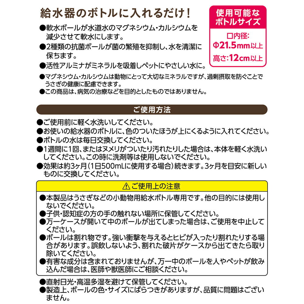 メーカー:ジェックス品番:66087カルシウム・マグネシウムを除去しておいしい水に!GEX ピュアクリスタル ボトルにPON ラビット対象うさぎ特長●給水器のボトルに入れるだけ!4種のボールで、余分なカルシウムを除去し軟水に!菌の繁殖を抑制し、清潔なお水を維持します。●ボトルの口をふさがない安心構造です。内容量1本材質抗菌セラミックス、軟水セラミックス、活性アルミナ、PP原産国中国ご使用方法●初めてご使用になる前に、スティック本体を軽く水洗いして、ペットボトルや給水ボトルに水道水と一緒に入れてそのままご使用ください。●お皿などで給水する場合、本品を入れたペットボトル等を冷蔵庫で保管し、給水してください。●サプリメント等と一緒にご使用いただけます。ご注意※有害物質は含まれておりませんが、万が一飲み込んだ場合は直ちに吐き出させ、医師にご相談ください。お問い合わせについて商品の不明点につきましては、下記にお問い合わせください。ジェックスサービスセンターTEL:072−966−0054GEX ピタポタボトル 380mL うさぎ 給水器GEX ピタポタノズル … GEX ピュアクリスタル ボトルにPON ラビット 4972547044358 66087 小動物 ウサギ 兎 水 給水 飲み水 健康 ミネラル 殺菌 水道水 浄化 浄水 水質浄化スティック 水質浄化剤 カルシウム マグネシウム 除去 軟水 amo 20240213 kak 24y02m y24m02 linegex24m gex2404spanim opa2_choku■この商品をお買い上げのお客様は、下記商品もお買い上げです。※この商品には付属しません。■GEX ピタポタボトル 380mL うさぎ 給水器GEX ピタポタノズル