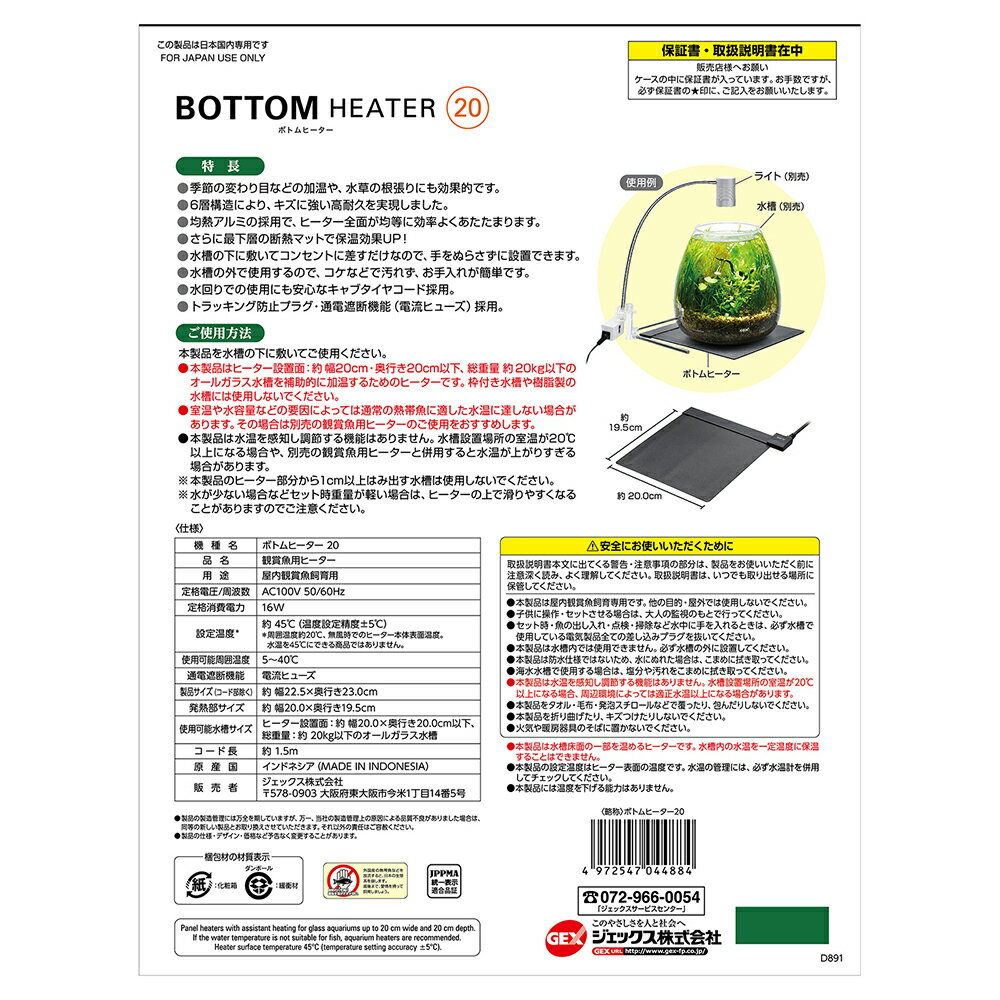 メーカー:ジェックス品番:7863水槽の底からじんわり加温!GEX ボトムヒーター20対象屋内観賞魚適合水槽サイズ(約) ヒーター設置面:幅20.0×奥行20.0cm以下、総重量:20kg以下のオールガラス水槽※枠付き水槽や樹脂製の水槽には使用しないでください。特長●屋内観賞魚飼育用のヒーターです。●季節の変わり目などの加温や、水草の根張りにも効果的です。●6層構造により、キズに強い高耐久を実現しました。●均熱アルミの採用で、ヒーター全面が均等に効率よく温まり、最下層の断熱マットで保温効果が高まります。●水槽の外で使用するので、コケなどで汚れず、お手入れが簡単です。●水回りでの使用にも安心なキャブタイヤコードを採用しています。●トラッキング防止プラグ、通電遮断機能(電流ヒューズ)を採用しています。数量1個仕様定格電圧/周波数:AC100V 50/60Hz定格消費電力:16W設定温度:約45℃(温度設定精度±5℃)※周囲温度約20℃、無風時でのヒーター表面温度。水温を45℃にできる商品ではありません。使用可能周囲温度:5〜40℃通電遮断機能:電流ヒューズコード長:約1.5mサイズ(約)製品サイズ(コード部除く):幅22.5×奥行23.0cm発熱部サイズ:幅20.0×奥行19.5cm原産国インドネシアご注意※本品は屋内観賞魚飼育専用のヒーターです。目的以外の用途、屋外では使用しないでください。※子供に操作、セットさせる場合は、大人の監視のもと行ってください。※セット時、魚の出し入れ、点検、掃除など水中に手を入れるときは、必ず水槽で使用している電気製品すべての差し込みプラグを抜いてください。※本製品は水槽内では使用できません。必ず水槽の外に設置してください。※本製品は防水仕様ではないため、水に濡れた場合は、こまめに拭き取ってください。※海水水槽で使用する場合は、塩分や汚れをこまめに拭き取ってください。※本製品は水温を感知し調節する機能はありません。水槽設置場所の室温が20℃以上になる場合、周辺環境によっては適正水温以上になる場合があります。※本製品をタオル、毛布、発泡スチロールなどで覆ったり、包んだりしないでください。※本製品を折り曲げたり、傷つけたりしないでください。※火気や暖房器具のそばに置かないでください。※本製品は水槽底面の一部を温めるヒーターです。水槽内の水温を一定温度に保温することはできません。※本製品の設定温度はヒーター表面の温度です。水温の管理には、必ず水温計を併用してください。※本製品には温度を下げる能力はありません。※本製品から1cm以上はみ出す水槽には使用しないでください。お問い合わせについて商品の不明点につきましては、下記にお問い合わせください。ジェックス株式会社 ジェックスサービスセンターTEL:072−966−0054GEX グラスアクア ティアー N 20cm テラリウム 小型水槽 ガラス水槽GEX グラステリア フィット 100 水槽 小型水槽 ガラス水槽 … 25camgexhet メーカー画像 GEX ボトムヒーター20 4972547044884 20240904 y24m09 ktym ボトムヒーター ジェックス ヒーター 水槽 下部 底面 じんわり 加温 季節の変わり目 季節 水草 根張り 均等 温まる あたたまる 効率 特殊ファイバー 均熱アルミ 保護シート 断熱マット グラスアクア ベタ水槽 ベタ アクアリウム用品 アクアリウム アクア 小型水槽 45℃ 水槽外ヒーター オールガラス水槽 屋内観賞魚 観賞魚 飼育 16W コード付き 保温ボード シート 24camgexhet01 24camgexhet bnr2510gexh■この商品をお買い上げのお客様は、下記商品もお買い上げです。※この商品には付属しません。■GEX グラスアクア ティアー N 20cm テラリウム 小型水槽 ガラス水槽GEX グラステリア フィット 100 水槽 小型水槽 ガラス水槽