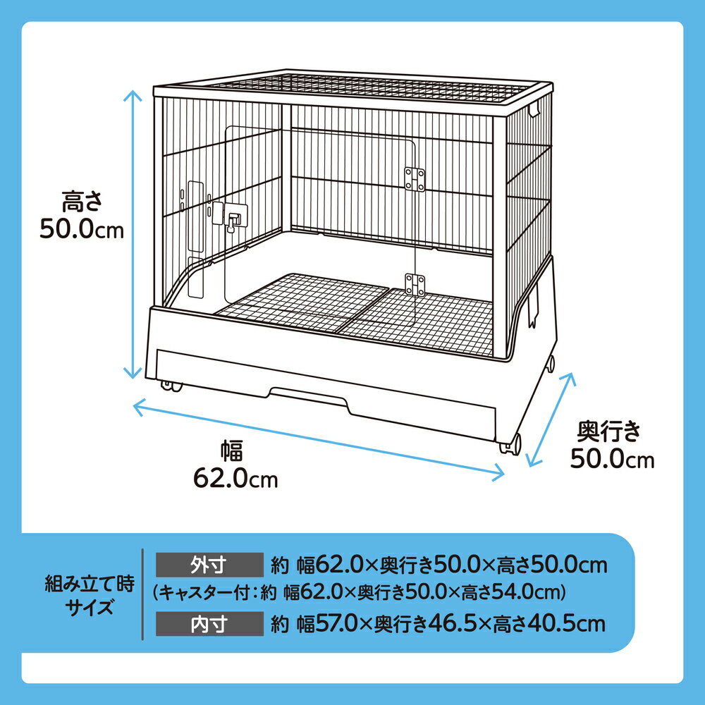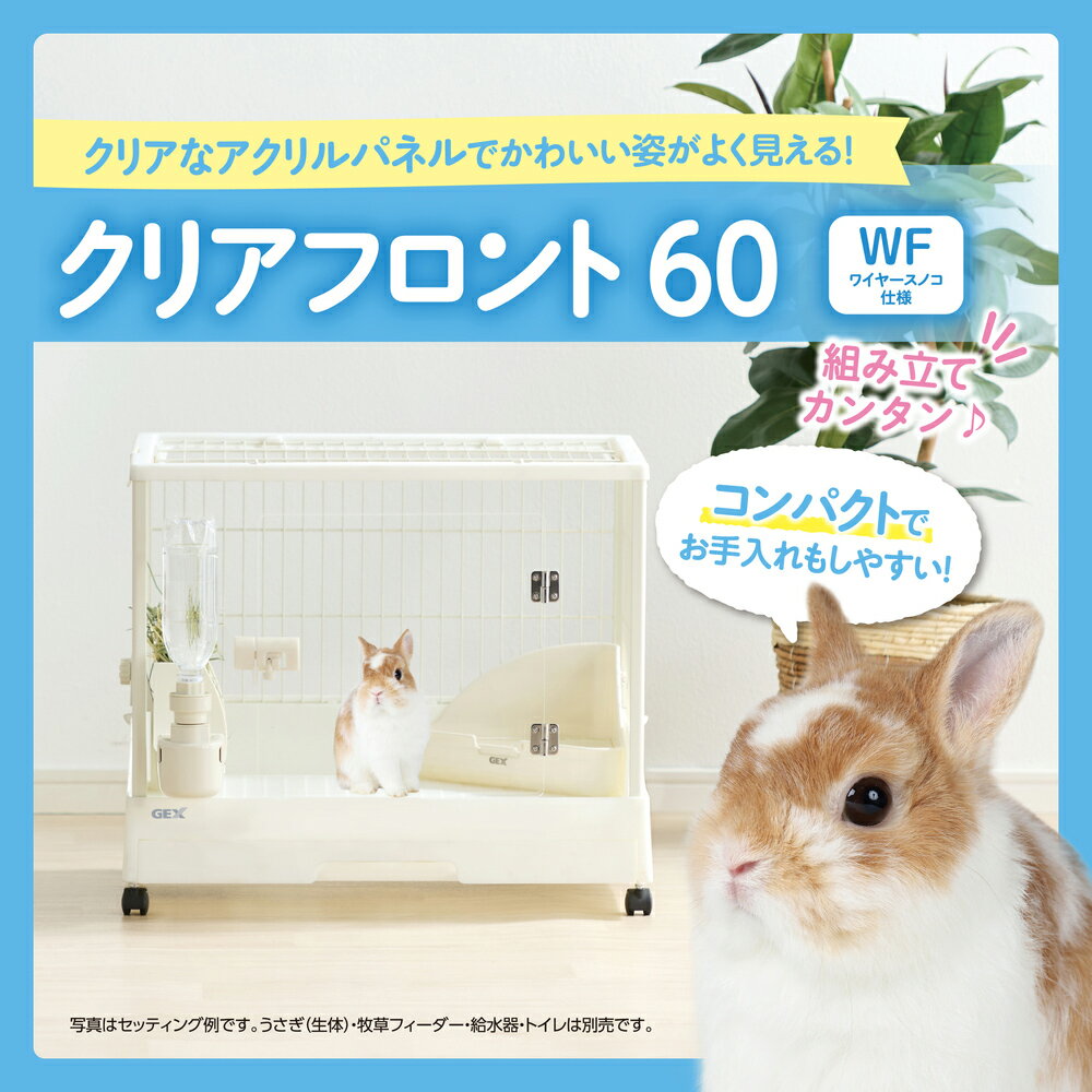 メーカー:ジェックス品番:66264かわいい姿がよく見える!GEX クリアフロントWF対象うさぎなどの小動物特長●小動物用のケージです。●天面がワイヤーパネルになっており、大きく開き、固定できるのでお手入れ時に便利です。●ケージ内のスキマが狭いため、牧草などが入りにくいです。●床面はお手入れしやすい2分割のワイヤースノコになっています。●さっと引き出せてお手入れ簡単な引き出しトレイがついています。セット内容ジョイント(長)×2ジョイント(短)×2扉×1前板×1天面(バックル付き)×1左側面×1背面×1右側面×1ベーストレイ(バックル付き)×1ワイヤースノコ×2引き出しトレイ×1キャスター×2ストッパー付きキャスター×2蝶番A×2蝶番B×2ボルト×8ナット×8ロックA×1ロックB×1ロック用ネジ×6専用ドライバー×1組立時サイズ(約)外寸:幅62.0×奥行50.0×高さ50.0cm(キャスター付き:幅62.0×奥行50.0×高さ54.0cm)内寸:幅57.0×奥行46.5×高さ40.5cm扉サイズ:34.0×高さ33.5cmトレイサイズ:幅55.0×奥行43.5cmスノコメッシュサイズ:1.1×1.1cmワイヤー間隔:2.2cm重量(約)7.3kg材質ベーストレイ、引き出しトレイ:PPワイヤースノコ:鉄前板、扉:アクリルキャスター:PP、鉄原産国中国ご注意※本品は屋内小動物飼育専用のケージです。目的以外の用途では使用しないでください。※本製品を設置する場所は、水平が保たれる安定した平面を選んでください。※ケージのワイヤー間に顔が入ってしまう大きさのペットには使用しないでください。※スノコの境目に足を挟む場合がありますので注意してください。※空袋は直ちに子供、ペットの手の届かない場所に処分してください。口や鼻をふさぎ、窒息する恐れがあります。※ペットの予期せぬ行動が思わぬ事故につながる恐れがありますので、目の届く範囲で使用してください。※飼育時における事故などに関しましては責任を負いかねますので、あらかじめご了承ください。※製品の製造管理には万全を期していますが、万一、当社の製造管理上の原因による品質不良がありました場合は、同等の新しい製品とお取り換えさせていただきます。お問い合わせについて商品の不明点につきましては、下記にお問い合わせください。ジェックス株式会社 サービスセンターTEL:072−966−0054GEX クリアフロント60 幅62.0×奥行50.0×高さ50.0cmGEX クリアフロント70HighGEX エアグルームDCGEX 四角ラビレットXL消臭セット ミルキーホワイトGEX クリアフロント80 飼育ケージ ケージ ゲージ ウサギ うさぎうさぎケージ GEX スマートルームクリア−2(70×55×54.5cm) うさぎ ケージ … minimalcages メーカー画像 GEX クリアフロント60WF 4972547045980 20250219 y25m02 ktym ジェックス クリア アクリルパネル アクリル パネル 小動物 ウサギ お掃除ラクラク お掃除 掃除 楽 組み立て簡単 組立 組み立て カンタン 簡単 ペット ペット用品 天面 ワイヤー ワイヤーパネル 正面扉 ワイヤースノコ すのこ 2分割 引き出し トレイ 引き出しトレイ キャスター付き キャスター コンパクト 大きく開く 扉固定 固定 着脱可能扉 部屋んぽ 飼育用ケージ ケージ 飼育 屋内 小動物飼育 gex_rabbit_cage y25m02newani opa2_choku 25raf_m_gex 25raf_m0GEX クリアフロント60WF うさぎの飼育セット 幅62.0×奥行50.0×高さ50.0cm■この商品をお買い上げのお客様は、下記商品もお買い上げです。※この商品には付属しません。■GEX クリアフロント60 幅62.0×奥行50.0×高さ50.0cmGEX クリアフロント70HighGEX エアグルームDCGEX 四角ラビレットXL消臭セット ミルキーホワイトGEX クリアフロント80 飼育ケージ ケージ ゲージ ウサギ うさぎうさぎケージ GEX スマートルームクリア−2(70×55×54.5cm) うさぎ ケージ