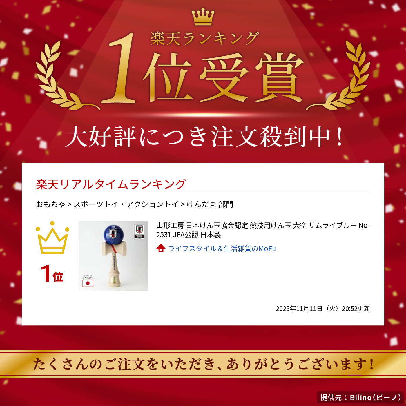 山形工房の「大空 サムライブルー」は、日本けん玉協会認定・競技用けん玉のJFA公認モデル。サッカー日本代表「SAMURAI BLUE」デザインで、応援気分も盛り上がる特別仕様です。国産の高品質素材を使用し、軽くて握りやすく、正確な技の練習にも最適。競技用としても遊び用としても使え、大人から子どもまで楽しめます。伝統的な日本の遊び道具でありながら、デザイン性も高く、ギフトやプレゼントにもぴったり。おうち遊びや練習用、スポーツイベントの記念品としてもおすすめです。商品名競技用けん玉 大空カラーサムライブルーサイズ全長/18cmけんの長さ16cm 玉の直径6cm材質材質:ブナ、サクラ原産国糸、取扱説明書、アプリブランド・メーカー山形工房その他仕様対象年齢:6歳以上予備糸1本付【検索用】