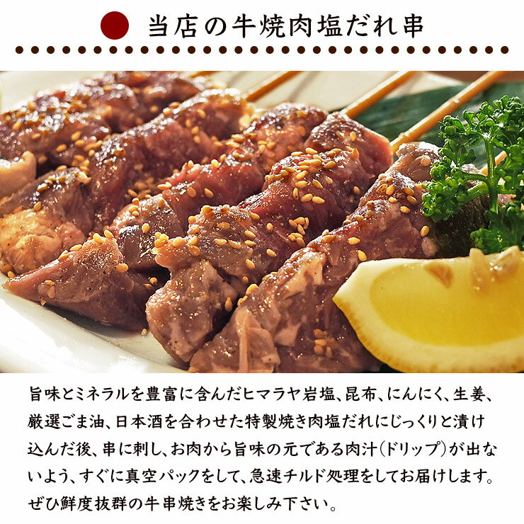 焼肉の中でもそのやわらかさとじゅわ〜っと溢れる濃厚な旨味と肉汁で焼肉ファンからも絶大な人気を持ち、牛1頭からわずか2kgしか取れない希少部位の「ハラミ」!クセもなく、程よい脂肪が付いた、牛肉本来の美味しさが堪能できるお肉です!当店の牛ハラミは、更に美味しく召し上がっていただけるように独自の柔らか加工をしていますので、とってもやわらかい牛ハラミに仕上がっています。柔らかく仕上げた牛ハラミを、当店特製の牛焼き肉塩だれにじっくり漬け込んで、ただ焼くだけで串焼き専門店の牛焼き肉塩だれ串がご家庭で楽しめる絶品牛串焼きに仕上げました!是非ご家庭で、美味しい牛串焼きを心ゆくまでご堪能下さい。調理前の生の状態でお届けします。ホットプレート、フライパン、バーベキューで焼くだけで、出来たてアツアツの牛串焼きをご堪能できます♪お花見、BBQ、おうち会で牛串焼きを楽しんで下さい!当店の牛串焼きは、新年会、忘年会、お花見、母の日、父の日、敬老の日、誕生日、バレンタインデー、ホワイトデーなどなど、各イベントや、贈り物やお返しにも大活躍します。またお中元・お歳暮にもご好評いただいております。■当店の牛串焼きについて■当店独自の柔らか加工をした後に、ミネラルと旨みの豊富なヒマラヤ原産のピンクソルト、雑味の少ないイタリア岩塩、塩麹、昆布、清酒、にんにく、生姜、厳選ごま油を合わせた特製焼き肉塩だれにじっくりと漬け込んで、お肉の中までしっかりと旨味を染み込ませた、ただ焼くだけで美味しく召し上がれる絶品牛串焼きです。魚焼きグリル、グリル、トースター、フライパン、BBQで簡単に串焼き専門店の牛串焼きが食べられます♪お肉専門の料理人が丁寧に、心を込めて1串1串仕込んで、牛肉の美味しさを真空パックに閉じ込めてお届けします。5本ずつ真空パックにしてお届けしますので、使い勝手も抜群です。■■美味しい牛串の焼き方■■【魚焼きグリルで焼く】●受け皿に水を張って、予め中火で予熱しておきます。表面に美味しそうな色の焦げ目がついたら、裏側にひっくり返して表側と同様の焦げ目がつくまで焼きます。もう一度ひっくり返してお好みの加減まで焼き上げていきます。あまりしょっちゅうひっくり返していると中に火が通りにくくなりますので、2〜3回を目安にしてひっくり返して焼くと美味しく焼き上がります。串の持ち手部分にアルミホイルを巻き付けておくと、串が燃えずにきれいに焼けます。ミディアムレア、ウェルダンとお好きな焼き加減でお召し上がり下さい!【フライパンで焼く】●フライパンはガスであれば中火、ホットプレートの場合は180度設定で十分にフライパンを温めて焼きます。お肉から出た脂がピチピチというくらいが程よい焼き加減です。表面をこんがりと焼き色がつくまで焼いていきます。両面に美味しそうな焼き色がついたところで、ふたをして2〜3分程度弱火で焼き足すと芯まで火が通り、中しっとりの牛串焼きになります。ミディアムレア、ウェルダンとお好きな焼き加減でお召し上がり下さい!【トースターで焼く】●予め予熱しておいたトースターに入れ、片面3分〜4分、しっかりと焼き色がついたらひっくり返して再度3分〜4分を目安に焼き上げます。表面にこんがりと焼き色がついたら完成です。串の持ち手部分にアルミホイルを巻き付けておくと、串が燃えずにきれいに焼けます。ミディアムレア、ウェルダンとお好きな焼き加減でお召し上がり下さい!【炭火で焼く】●火柱が落ち着いた白い炭の状態の遠火の強火で、炙るような感じで満遍なく焼いていきます。表面に軽く焦げ目がついたら、裏側にひっくり返して表側と同様に軽く焦げ目がつくまで焼きます。あとはお好みの加減まで焼き上げていきます。あまりしょっちゅうひっくり返していると中に火が通りにくくなりますので、3〜4回を目安にしてひっくり返して焼くと美味しく焼き上がります。ミディアムレア、ウェルダンとお好きな焼き加減でお召し上がり下さい!■商品の配送温度帯について■●当店では、より新鮮で美味しい商品をお届けするために、商品の作りおきはせず、商品発送日当日に、調理、パック個装、チルド処理をして発送しております。また、商品到着後すぐにお召し上がり頂けますよう、クール冷蔵便にて発送させていただきます。(※商品発送後、お届けまでに4日以上かかる遠方エリアへのお届けの場合は、品質保持のためクール冷凍便にて発送させていただく場合もございます。)商品温度と配送会社の冷蔵庫内温度の違いにより、商品パッケージに水滴が付着する可能性もございますが、品質には全く問題ございませんので、ご安心下さいませ。すぐにお召し上がりにならない場合は、冷凍庫にて保存して頂きますようお願い致します。真空パックにて個装しておりますので、冷凍保存をして頂けましたら、冷凍した日より約12ヶ月は品質が保たれます。■冷凍保存後の美味しい
