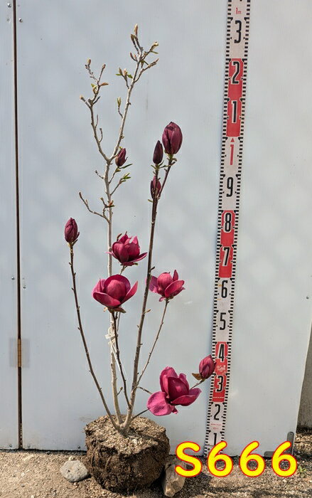 番号の商品をお送りします。 写真は25年7月11日に撮影しました。 開花の写真は25年4月11日に撮影しました。 季節によって状態は変化します。257a-uモクレン ジェニー 【分類】モクレン科モクレン属 の落葉低木 【学名】Magnolia soulangeana ‘genie’ 【原産】園芸種(中国南西部 雲南省、四川省原産) 【開花期】3月〜4月 【樹高】 2〜4m 【栽培適地】北海道南部以南 モクレンは日本では春を告げる花として、古くから愛されています。毎年春にはたくさんの花を咲かせ、耐寒性や耐暑性も強いので、比較的育てやすく管理のしやすい樹木です。 モクレン ジェニーは黒色に近い赤黒色(~紫色)の花色と、直径約15cmのチューリップの様な形をした花が魅力の園芸品種です。 ジェニーは2011年にドイツで行われた国際園芸見本市(Internatioale Pflanzen Messe)でBest Novelty Award 2011を受賞した品種です。 ニュージーランドのヴァンス・フーパー氏(Vance Hooper)によって作出された新しいタイプのモクレンです。 花の形はカップ咲きで、色は濃いワインレッド色です。矮性品種で樹形もコンパクトにまとまり、背丈が低いうちからよく開花してくれます。 また開花期が長く、春から初夏まで長期にわたって花を咲かせる品種で、その年の気候によっては夏が終わる頃まで咲き続けることもあります。(気候や地理的条件などによっては花が咲かないこともあります。) 栽培 植える場所は、水はけが良く日当たりの良い土壌を好みます。 腐葉土などの有機質を土に混ぜ込んで、深植えにならないように植えつけます。 植えこんだ後の水やりは日に何度も与えるのではなく、太陽が沈んでから時間をかけて十分に与えるようにしましょう。 耐寒性・耐寒性も強く、氷点下10度程度までは耐えることが可能です。 施肥は、主に冬に行います。剪定は、開花後~夏に行い、背丈を抑制したい場合は高く伸びすぎた枝の切り戻しをします。 その他、込みすぎる枝葉を切り取り、伸びすぎた枝などもカットしてください。台木から芽が出ることもありますので、接ぎ口より下から出る芽は台木の芽ですので、すべてカットしてください。 根が荒いので、大きくなってからの移植には前もって根回しをして細かな根が出てから行うことが必要です。 目立った病害虫はありません。