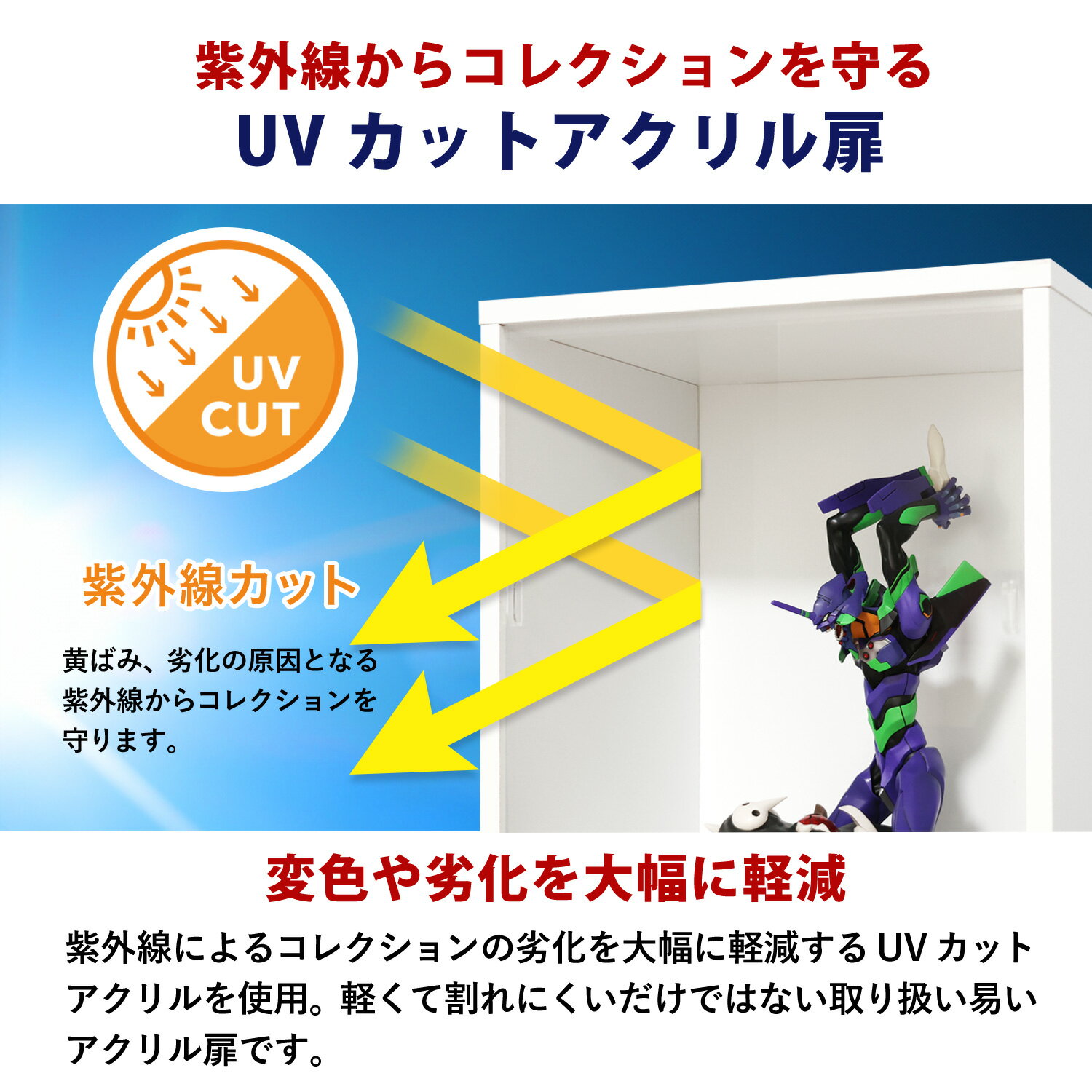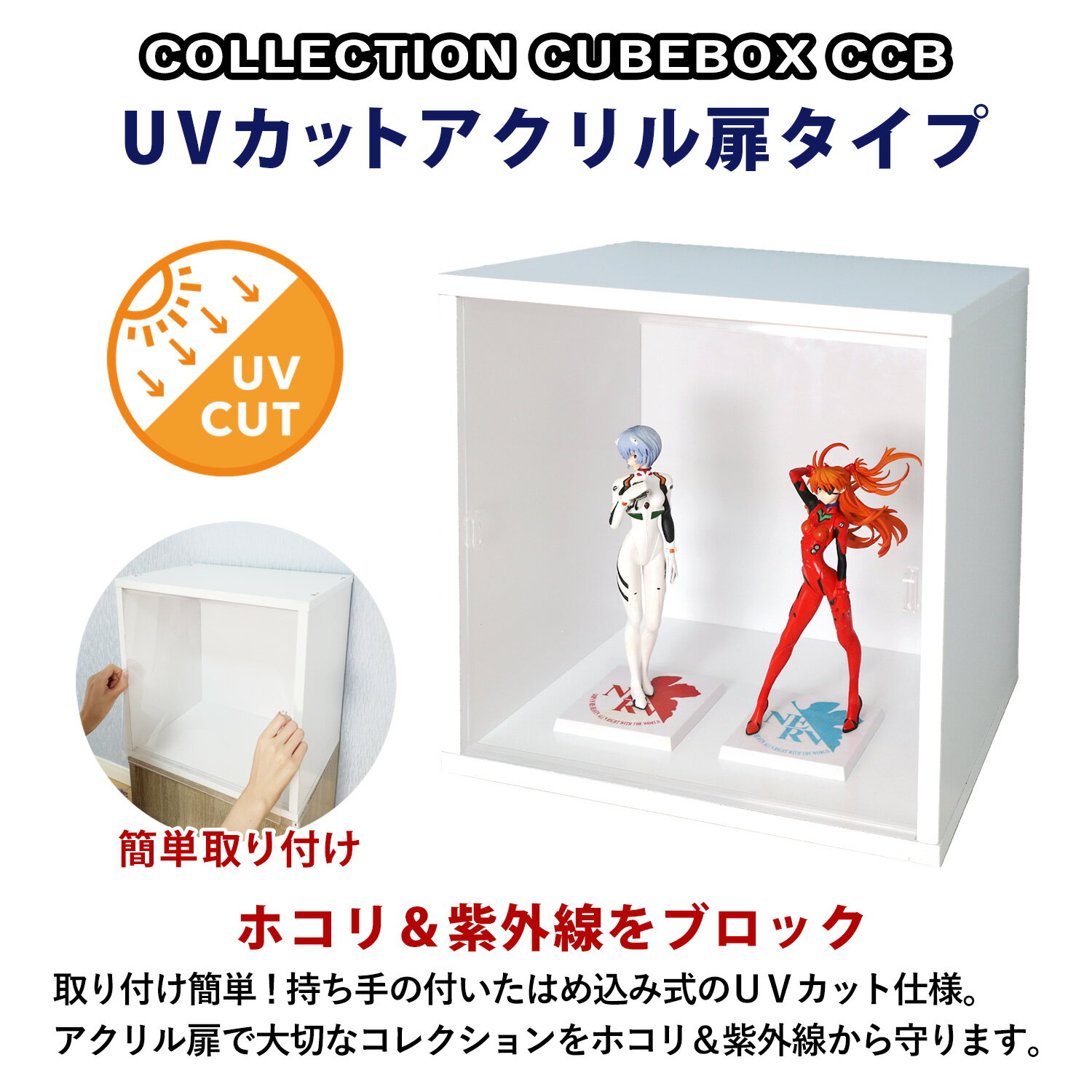 ※【ギフトラッピング不可】こちらの商品はラッピングに対応しておりません。 ※「UVカット アクリル扉タイプ」の商品ページです。 ※仕様は下記を参照ください。 ◆◇◆ コレクション キューブボックス ◆◇◆ UVカット アクリル扉タイプ ◇取り付け簡単!持ち手の付いたはめ込み式のアクリル扉。 ◇大切なコレクションをホコリと紫外線から守るUVカットアクリル仕様。 ◇上下にレールを貼り付け、アクリル扉をはめ込むだけ(ケンドン式) ◇はめ込み式なので省スペースで開閉できます。 ◇紫外線によるコレクションの劣化を大幅に軽減するUVカットアクリルを使用。 本体 サイズ 外寸(約):幅38.1×奥行28.5×高さ38.1cm 内寸(約):幅34.9×奥行27.1×高さ35.1cm 重量 (約)5kg 材質 プリント紙化粧繊維板 生産国 インドネシア 梱包仕様 サイズ(約):44×39×7.7cm 重量(約):6kg アクリル扉 サイズ (約)幅34.7×高さ34.5×厚さ0.2cm 重量 (約)0.5kg 材質 アクリルパネル:アクリル樹脂 上用・下用レール:塩ビ樹脂 生産国 中国 梱包仕様 サイズ(約):幅37.7×奥行37.8×高さ2.9cm 重量(約):0.5kg 注意事項 ※お届け時アクリル扉の表面には保護フィルムが貼られています。剥がしてご使用ください。 ※運送会社の配送中に外装箱に汚れが付く場合がありますが、商品は新品の良品ですのでご了承ください。 ※お客様で組み立てが必要な商品です。 ※商品の色や質感は撮影時の光加減やモニタ画面により異なります。 ※同シリーズ内でカラーやタイプ、オプション品等の種類が多い為、お間違いにご注意ください。
