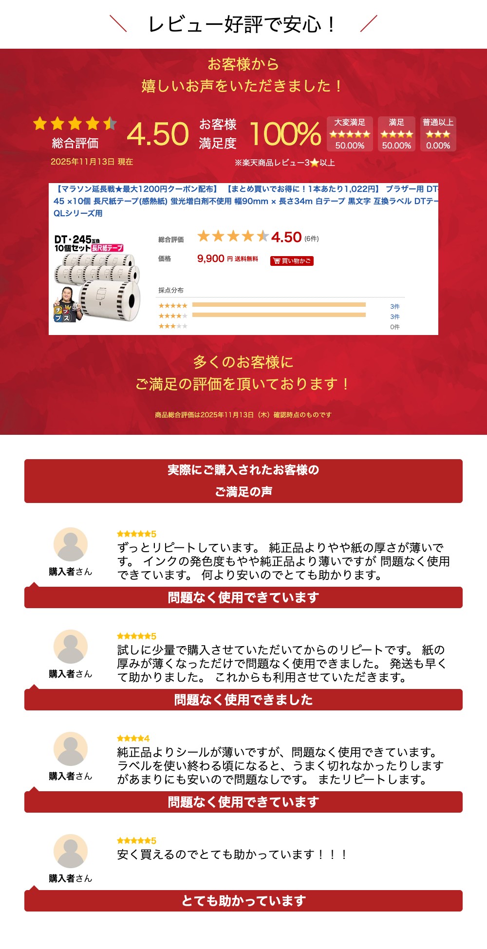 イベントキーワード ワンダフルデー お買い物マラソン マラソン スーパーSALE スーパーセール 0の付く日 5の付く日検索キーワード ブラザー 用 Brother 用 brother 用 BROTHER 長尺紙テープ(感熱紙) ラベル 白テープ 黒文字 ラベルロール 経費 経費削減 テープ DTテープ DTテープ 互換 互換ラベル ロール紙 感熱紙 蛍光増白剤不使用 サーマル ラベルロール紙 245 dk-245 DK-245 安価 安い QL-1050 Type QL-1115NWB 1050 type ql-1115nwb 使用上のご注意こちらの商品は互換ラベルです。純正品ではございません。純正や他社製のホルダーでは不具合が発生する場合があります。必ず専用ホルダーをご使用ください。パッケージやラベル等、外観が画像と違う場合がございますが、製品の内容や品質・対応機種には違いはございません。ブラザー用 DT-245 ×10個 長尺紙テープ(感熱紙) 蛍光増白剤不使用 幅90mm × 長さ34m 白テープ 黒文字 互換ラベル ブラザー用 DT-245 ×10個 長尺紙テープ(感熱紙) 蛍光増白剤不使用 幅90mm × 長さ34m 白テープ 黒文字 互換ラベル ■商品説明・本製品は純正品と同様にご利用いただける互換ラベルです。メーカー純正品ではございません。・用紙:長尺紙テープ(感熱紙)、ラベルサイズ:幅90mm × 長さ34m、色:白テープ/黒文字・本体付属のホルダーをご使用ください。・全数検品にて品質基準をクリアした商品だけを販売しています。配送時に多少のキズや擦れが見られる場合がございますが、新品未開封品のみ発送しておりますのでご安心ください。・国際規格であるISO14001、ISO9001認証に対応した当社提携工場で生産された高品質商品です。・改善が必要とされる場合は、当社の担当スタッフより提携工場と直接やり取りを行っております。連携を密にとり、品質の維持や向上に努めております。■サポートについて・ご注文日より1年間の保証期間を設けております。万が一の不具合の際は交換等、サポートさせていただきます。・ご不明点はメールだけではなく、お電話でもお問い合わせいただけます。専門スタッフが常駐する国内のコールセンターにて受け付けております。(平日10:00〜17:00)・お問い合わせメールは24時間受け付けております。専門知識をもったスタッフより必ず返信をさせていただきます。・ご購入前の相談も承っておりますので、お気軽にご連絡ください。 スペック詳細 商品名称 ブラザー用 DT-245 ×10個 長尺紙テープ(感熱紙) 蛍光増白剤不使用 幅90mm × 長さ34m 白テープ 黒文字 互換ラベル 対応メーカー ブラザー(Brother) サイズ 幅90mm × 長さ34m 色 白テープ/黒文字 対応機種 QL-1050 Type / QL-1115NWB 純正品番 DT-245 セット内容 ■DT-245×10個