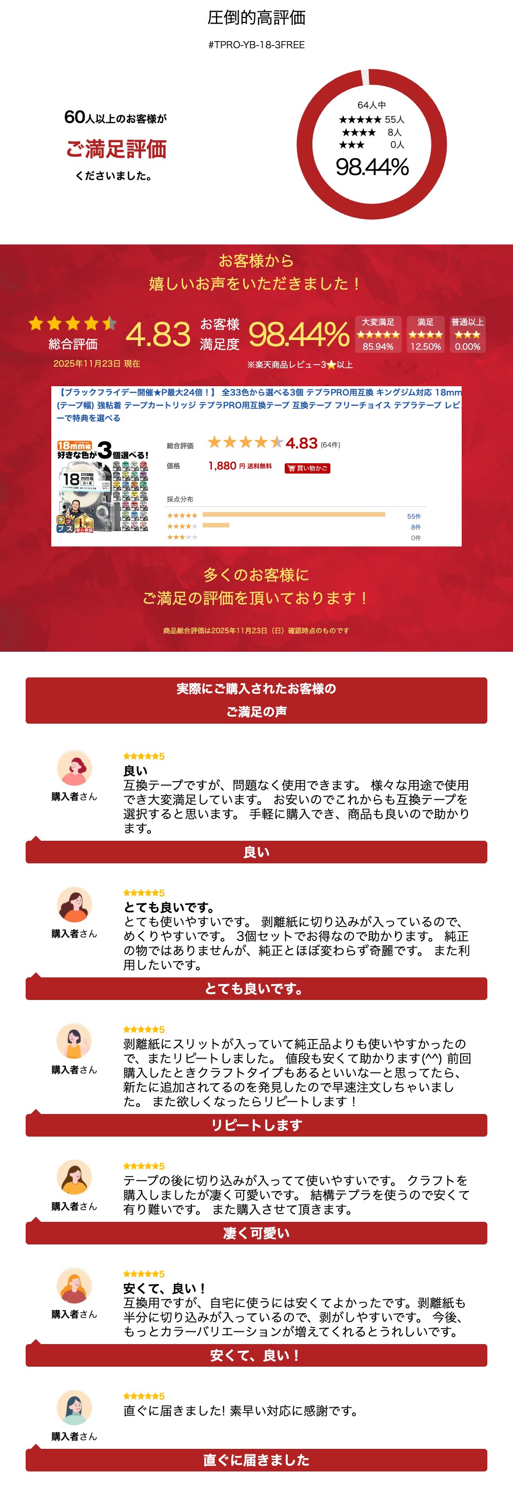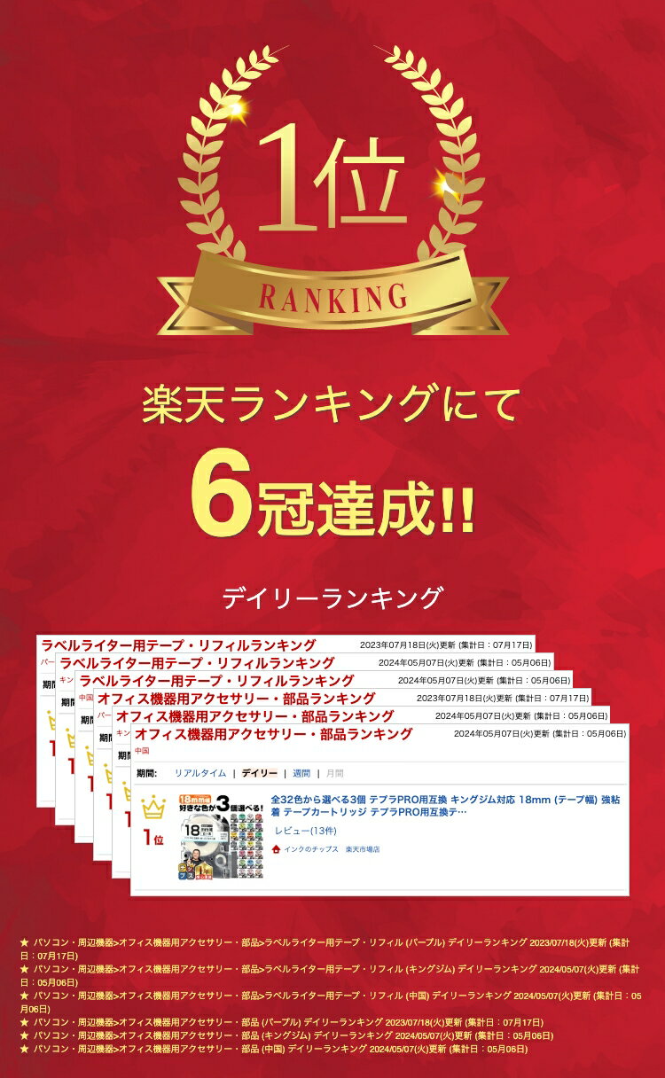 使用上のご注意 こちらの商品は互換テープカートリッジです。純正品ではございません。 テプラの機種によっては使用できないテープ幅があります。あらかじめご確認下さい。 ご使用前にカートリッジのギアを回して、テープのたるみを取ってからセットして下さい。 ハーフカット機能には対応しておりません。裏面スリットからお剥がし下さい。(クラフト紙は裏面スリットが入っておりません) こちらの商品はテプラ互換です。ネームランドではご使用頂けません。全32色から選べる3個 テプラPRO用互換 キングジム対応 18mm (テープ幅) 強粘着 テプラPRO用互換テープ全32色から選べる3個 テプラPRO用互換 キングジム対応 18mm (テープ幅) 強粘着 テプラPRO用互換テープ スペック詳細 セット内容 以下よりお好きなテプラPRO用互換を3個お選びください。※在庫がないカラーにつきましては入荷次第の販売となります■ SS18KW(白地/黒文字 18mm) ■ SC18RW(赤地/黒文字 18mm) ■ SC18BW(青地/黒文字 18mm) ■ SC18YW(黄色地/黒文字 18mm) ■ SC18GW(緑地/黒文字 18mm) ■ SD18KW(黒地/白文字 18mm) ■ ST18SW(透明地/白文字 18mm) ■ SM18XW(メタリック銀地/黒文字 18mm) ■ SM18ZW(メタリック金地/黒文字 18mm) ■ SC18KZW(黒地/金文字 18mm) ■ SD18RW(赤地/白文字 18mm) ■ SD18BW(青地/白文字 18mm) ■ SD18GW(緑地/白文字 18mm) ■ SC18YRW(黄地/赤文字 18mm) ■ ST18RW(透明地/赤文字 18mm) ■ SS18RW(白地/赤文字 18mm) ■ ST18BW(透明地/青文字 18mm) ■ SS18BW(白地/青文字 18mm) ■ SC18V(紫地/黒文字 18mm) ■ SC18P(ピンク地/黒文字 18mm) ■ SC18D(オレンジ地/黒文字 18mm ■ SC18H(灰地/黒文字 18mm) ■ SW18PH(ベビーピンク/グレー文字 18mm) ■ SW18YH(レモンイエロー/グレー文字 18mm) ■ SW18GH(ミントグリーン/グレー文字 18mm) ■ SW18BH(ミルキーブルー/グレー文字 18mm) ■ SW18VH(ラベンダー/グレー文字 18mm) ■ SWM18PH(水玉ピンク/グレー文字 18mm) ■ SWM18GH(水玉緑/グレー文字 18mm) ■ SWX18BH(チェック青/グレー文字 18mm)■ SPK18J(クラフト紙 ベージュ/黒文字 18mm)■ ST18KZ(透明地/金文字 18mm) ブランド名 キングジム 純正品番 ST18KW SS18KW SC18RW SC18BW SC18YW SC18GW SD18K (通常タイプ) ※純正品に強粘着タイプなし ST18S (通常タイプ) ※純正品に強粘着タイプなし SM18X (通常タイプ) ※純正品に強粘着タイプなし SM18Z (通常タイプ) ※純正品に強粘着タイプなし SC18KZ (通常タイプ) ※純正品に強粘着タイプなし SD18R (通常タイプ) ※純正品に強粘着タイプなし SD18B (通常タイプ) ※純正品に強粘着タイプなし SD18G (通常タイプ) ※純正品に強粘着タイプなし SC18YR (通常タイプ) ※純正品に強粘着タイプなし ST18R (通常タイプ) ※純正品に強粘着タイプなし SS18RW ST18B (通常タイプ) ※純正品に強粘着タイプなし SS18B (通常タイプ) ※純正品に強粘着タイプなし SC18V SC18P SC18D SC18H SW18PH SW18YH ※純正品なし SW18GH SW18BH SW18VH ※純正品なし SWM18PH ※純正品なし SWM18GH ※純正品なし SWX18BH ※純正品なしSPK18JST18KZ (通常タイプ) ※純正品に強粘着タイプなし 代表カラーマルチカラー シリーズ名テプラ(キングジム) 対応機種 SR606 / SR404 / SR707 / SR313 / SR515 / SR717 / SR616 / SR818 / SR-R980 / SR-R7900P / SR626 / SR828 / SR323 / SR424 / SR232 / SR333 / SR636 / SR737 / SR535 / SR900 / SR50 / SR30 / SR710 / SR510 / SR910 / SR610X / SR210 / SR3500P / SR51 / SR3900P / SR920 / SR520 / SR520X / SR40 / SR720 / SR6700D / SR220 / SR52 / SR930 / SR330 / SR530 / SR130 / SR40-B / SR600 / SR3700P / SR-PDP1 / SR300 / SR550 / SR300TF / SR300RK / SR950 / SR-RK1 / SR750 / SR-PBW1 / SR250 / SR150 / SR-GL1 / SR5900P / SR-RK2 / SR45 / SR55 / SR970 / SR-R2500P / SR5500P / SR670 / SR170 / SR-GL2 / SR370 / SR-R680 / SR-MK1 テープの長さ8m(純正同等) ※SPK18Jのみ5m(純正同等) タイプ強粘着 ※SPK18Jは強粘着ではありません。 商品説明・しっかり貼れて、はがれにくい強粘着タイプです。※SPK18Jは強粘着ではありません・本製品は純正品と同様にご利用いただける互換テープカートリッジです。メーカー純正品ではございません。・こちらの商品はテプラPRO用互換です。ネームランドではご使用頂けません。・国際規格であるISO14001、ISO9001認証の高品質商品です。・品質維持のため、個包装をしております。・改善が必要とされる場合は、当社の担当スタッフより海外提携工場と直接やり取りを行っております。連携を密にとり、品質の維持や向上に努めております。・クラフト紙の仕様上、他のテープに比べて印刷がカスレやすくなっております。※SPK18Jのみ・低速印刷をおすすめしております。(速度設定可能な機種のみ)※SPK18Jのみ・ハーフカット機能は対応しておりません。※SPK18Jのみ サポートについて・ご注文日より1年間の保証期間を設けております。万が一の不具合の際は交換等、サポートさせていただきます。・ご不明点はメールだけではなく、お電話でもお問い合わせいただけます。専門スタッフが常駐する国内のコールセンターにて受け付けております。(平日10:00〜17:00)・お問い合わせメールは24時間受け付けております。専門知識をもったスタッフより必ず返信をさせていただきます。・ご購入前の相談も承っておりますので、お気軽にご連絡くだ