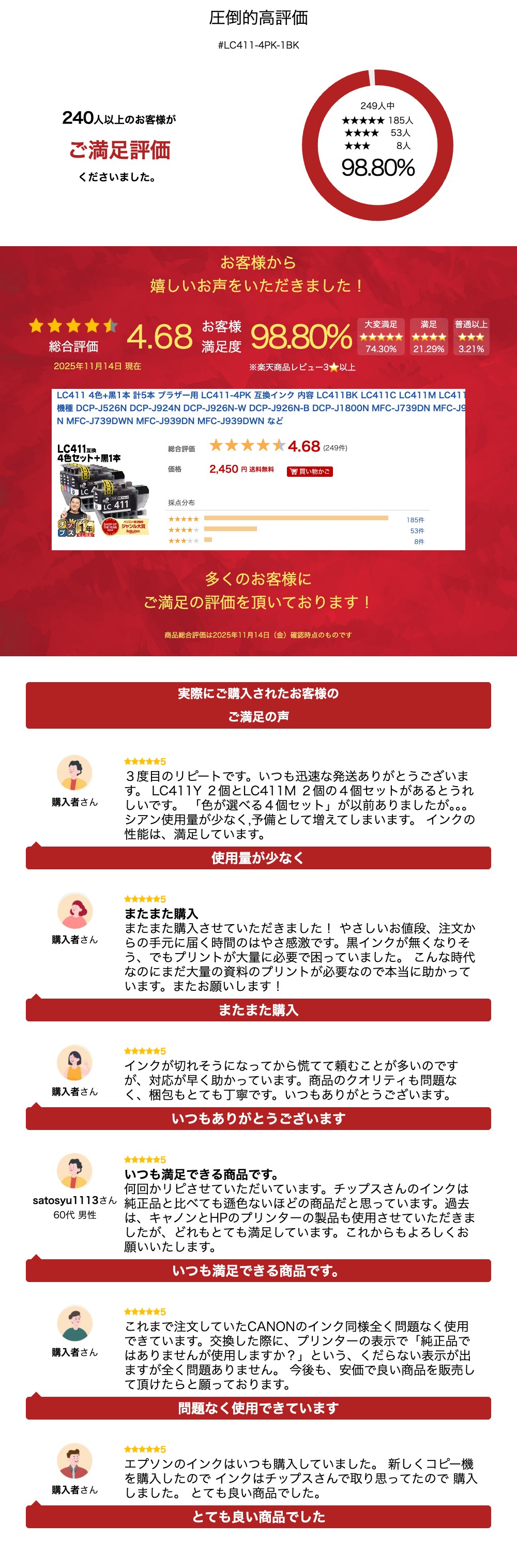 イベントキーワード ワンダフルデー お買い物マラソン マラソン スーパーSALE スーパーセール 0の付く日 5の付く日検索キーワード Windows11 インク ブラザー 用 ぶらざー brother 用 BROTHER 用 ブラザー インク ブラザー 互換インク lc411 LC411-4PK lc411-4pk 互換 互換インクカートリッジ 互換インク プリンター インク 在宅 LC411 DCP-J526N DCP-J914N DCP-J926N-W DCP-J926N-B DCP-J1800N MFC-J739DN MFC-J904N MFC-J739DWN MFC-J939DN MFC-J939DWN DCP-J528N DCP-J928N-W DCP-J928N-B MFC-J905N dcp-j528n dcp-j928n-w dcp-j928n-b mfc-j905n dcp-j526n dcp-j914n dcp-j926n-w dcp-j926n-b dcp-j1800n mfc-j739dn mfc-j904n mfc-j739dwn mfc-j939dn mfc-j939dwn インク dcp-j926n-w インク lc411 lc411-4pk mfc-j739dn インク mfc-j739dwn インク mfc-j904n インク mfc-j939dn インク mfc-j939dwn インク lc411 互換インク LC411BK LC411C LC411M LC411Y lc411bk lc411c lc411m lc411y ブラック シアン マゼンタ イエロー --> 使用上のご注意 キャップやシールを外す際、インクが垂れる場合がございますので、ご注意くださいますようお願いいたします。 純正インクから互換インク、またはリサイクル(再生)インクに切り替えた最初のうちは、それぞれのインクが混ざり合う為に印刷にかすれが出ることもありますので、その場合は通常よりも多めにヘッドクリーニングを実施して下さい。 使用後もインクがカートリッジ内に残りますが、カラ打ち防止用の予備分ですので、異常ではありません。ご使用直前まで開封せず、高温、凍結状態での保管は商品劣化する場合がございますのでお控えください。 お子様の手の届かない所へ保管し、目や口にインクがつかないようご注意ください。目に入った時は、こすらずに流水で十分に洗い流してから、お近くの医師に相談してください。 開封後約6ヶ月以内に使い切って下さい。 純正品と比べ色合いが違う場合がございますが新品交換/返金対象とはなりませんので、予めご了承くださいませ。 万一、弊社互換インク、またはリサイクル(再生)インクの使用によるプリンターの故障などが発生した場合、直前のご購入いただいた商品金額を上限として補償させていただきます。上記以上の補償は負いかねますので、ご不安ご心配な方は純正品のご利用をお勧め致します。 純正品との併用については動作確認を行っておりますが、他社製の互換・リサイクルインク・トナーカートリッジとの併用については動作確認を行っておりません。故障・不具合の原因になることがありますので純正品以外との併用は避けてくださいますようお願いいたします。ブラザー用 LC411 LC411-4PK 4色セット+ブラック1本 計5本 互換インクカートリッジ ブラザー用 LC411 LC411-4PK 4色セット+ブラック1本 計5本 互換インクカートリッジ【商品説明】・本製品は純正品と同様にご利用いただける互換インクカートリッジです。メーカー純正品ではございません。プリンタの相性問題の原因となる「ICチップ」は、業界最大手のAPEX社製の最新バージョンのICチップを採用し、高い安定性を実現しています。 ・本製品は、残量表示に対応しております。 ・インクには、純正同様の流動性と保湿性が高い、汎用ジェルインクの「HDカラー」を採用しています。プリントヘッドにやさしく、プリンタの寿命を縮めることがありません。 ・純正と同容量のインクを充填した互換インクカートリッジです。印刷枚数はブラック:約375枚、カラー:約500枚です。 ・カラ打ち防止のためにインクが多めに填充されております。使用後にカートリッジ内にインクが残っても異常ではありません。 ・国際規格であるISO14001、ISO9001認証のほか、欧州のRoHS指令、REACH規則、CEマーク認証に対応した当社提携工場で生産された高品質商品です。 ・品質維持のため、インクカートリッジはひとつずつ個包装をしております。改善が必要とされる場合は、当社の担当スタッフより海外提携工場と直接やり取りを行っております。連携を密にとり、品質の維持や向上に努めております。【サポートについて】・ご注文日より1年間の保証期間を設けております。万が一の不具合の際は交換等、サポートさせていただきます。・ご不明点はメールだけではなく、お電話でもお問い合わせいただけます。専門スタッフが常駐する国内のコールセンターにて受け付けております。(平日10:00〜17:00)・お問い合わせメールは24時間受け付けております。専門知識をもったスタッフより必ず返信をさせていただきます。・ご購入前の相談も承っておりますので、お気軽にご連絡ください。※カラ打ち防止のためにインクが多めに填充されています。使用後にカートリッジ内にインクが残っても異常ではありません。手厚いアフターサポートもついてますので、安心してご利用ください!※こちらは純正品ではありません。純正同様に使用可能な「互換インクカートリッジ」です。 スペック詳細 対応メーカー ブラザー(brother) 純正品番 LC411BK(ブラック)LC411C(シアン)LC411M(マゼンタ)LC411Y(イエロー) 顔料/染料 全て:染料 印刷枚数ブラック:約375ページ(1本あたり